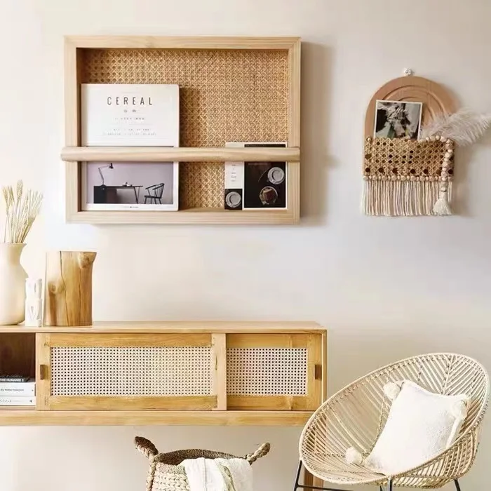 This content describes a high-quality storage holder shelf made from rattan wicker and bamboo wood, designed to hang on the wall. The shelf is suitable for holding magazines and other items, providing a stylish and functional storage solution. Its natural materials give it a rustic and eco-friendly look, while the wall-mount design saves space and keeps items organized. This storage holder shelf is durable and well-crafted, making it a great addition to any home or office space.