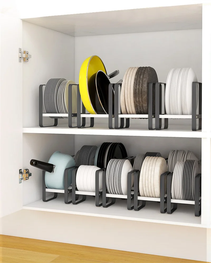 4. Soporte de plato multipropósito: Este estante de platos multifuncional se puede usar para almacenar platos., tapas, montones, tazas, bochas, Utensilios de cocina, tablas de corte, pero también sirve como mini estantería o titular de CD.
