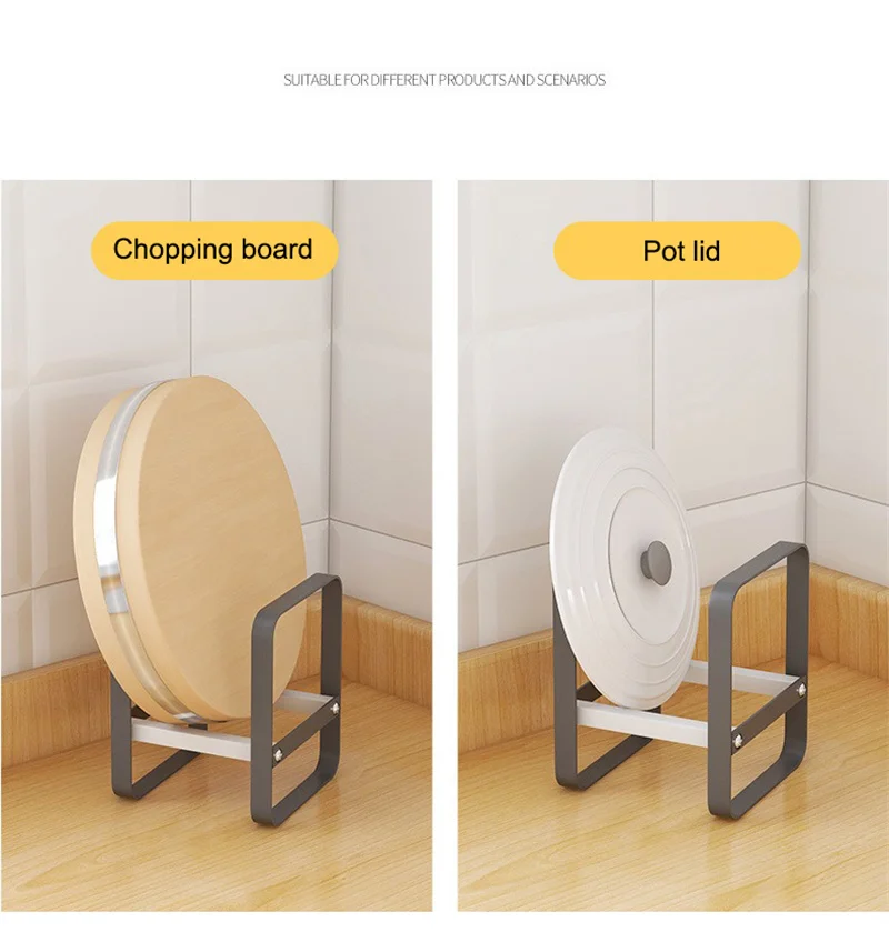 Esta rejilla de almacenamiento de cocina es un organizador multifuncional para platos., montones, tapa, platos, tablas de corte, bochas, y cucharas. El estante de metal está diseñado para sostener y mostrar varios artículos de cocina., Ayudando a mantener su cocina organizada y sin desorden. Es una solución conveniente para almacenar y acceder a todos sus elementos esenciales de cocción en un solo lugar..