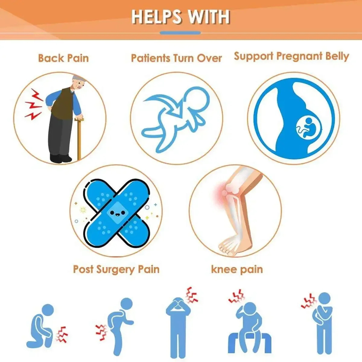 – This is a home care assistance treatment pillow. (1) It can help patients turn over, change their posture, assist leg passive lifting, improve leg blood circulation; (2) At the same time is conducive to supporting pregnant women’s belly to create a good environment for pregnant women to sleep. (3) Right angle helps relax your neck, being good for acid reflux, mala circulacion, allergies or any other condition which breathing may be impaired in supine position.