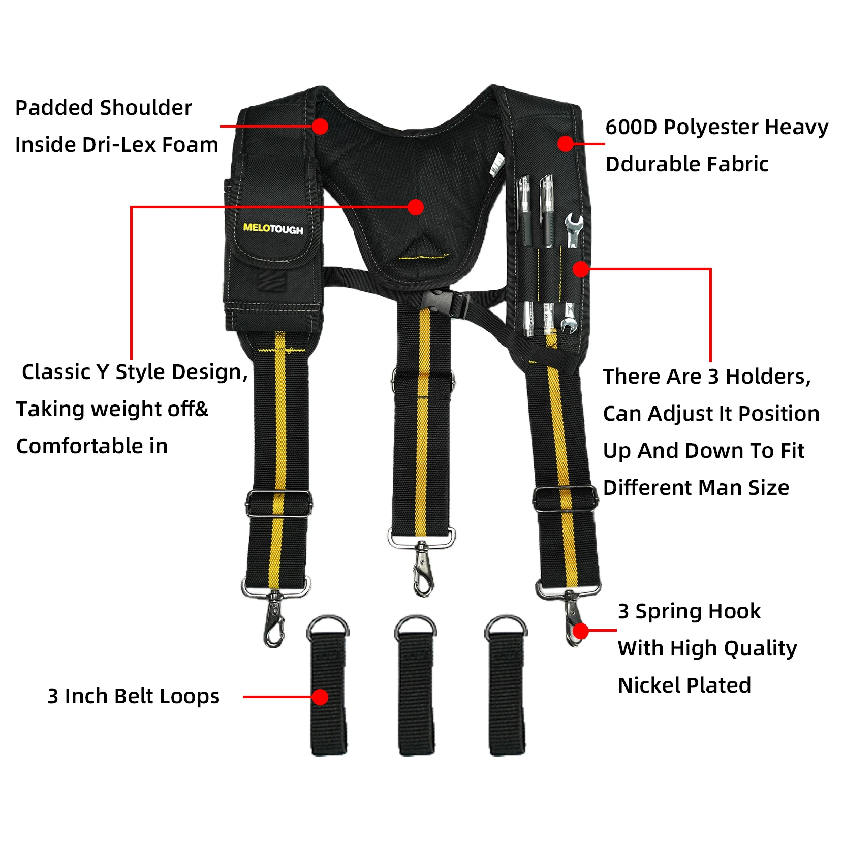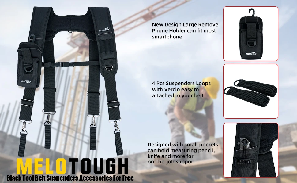 🛠️Tool Belt Suspender for constructor/farmer/carpenter — Extreme Comfort and 4-point Support Design for your Tool belt, Large Detachable Phone Holder, Pencil holder, tape measure webbing holder make your job easier. Dri-Lex foam helps cushion weight of tool belt without trapping heat and moisture.