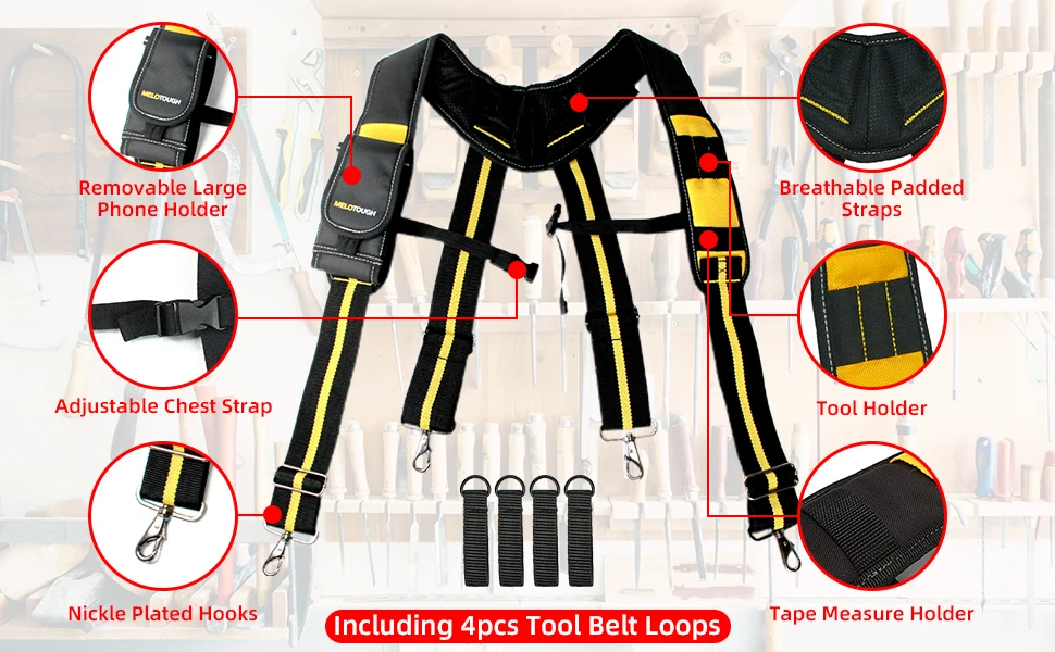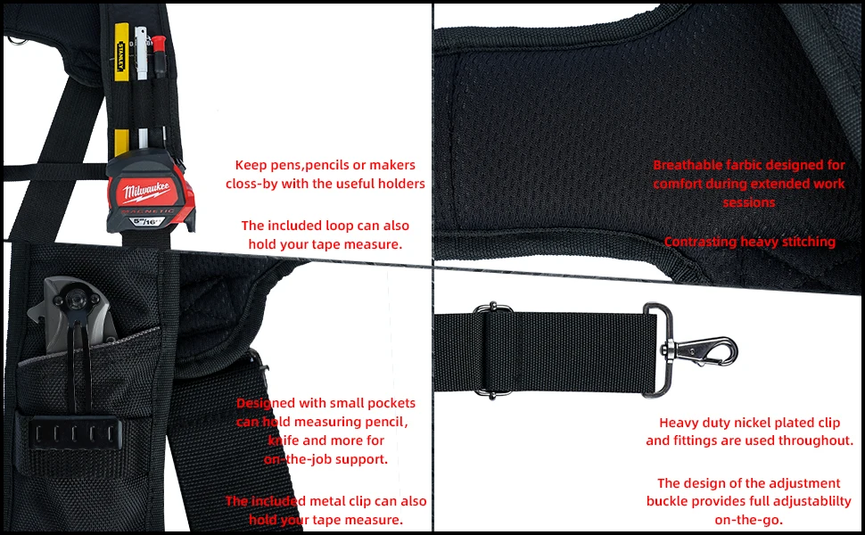👷Tool Belt Harness — If you want to replace your old one tool belt suspender, this one is your perfect choice. If you feel back pain and tool belt with heavy weight pouch, you need to take this one with no regrets. Quality nickel plated, 4 free suspenders durable made can be attached to any tool belt combo system.