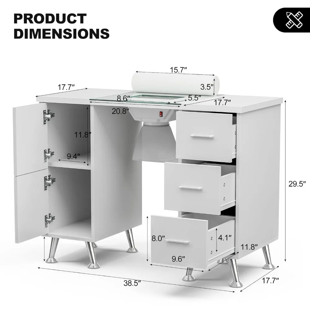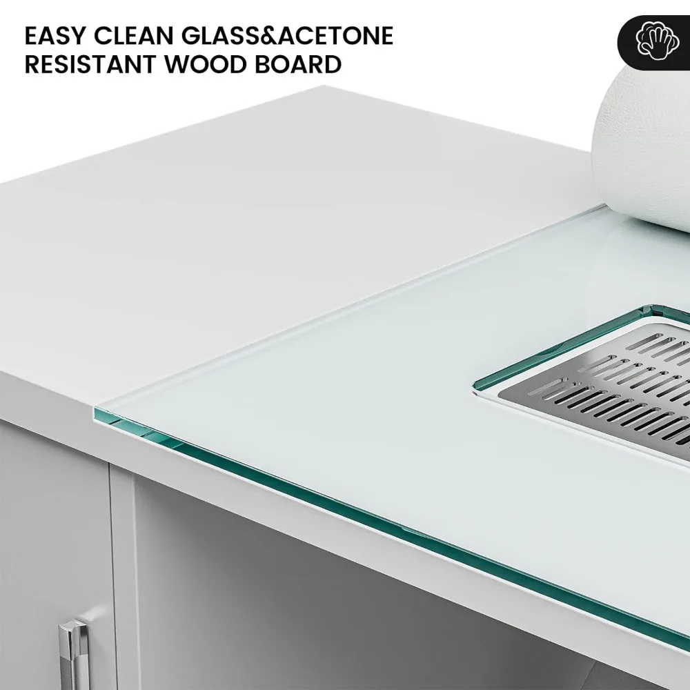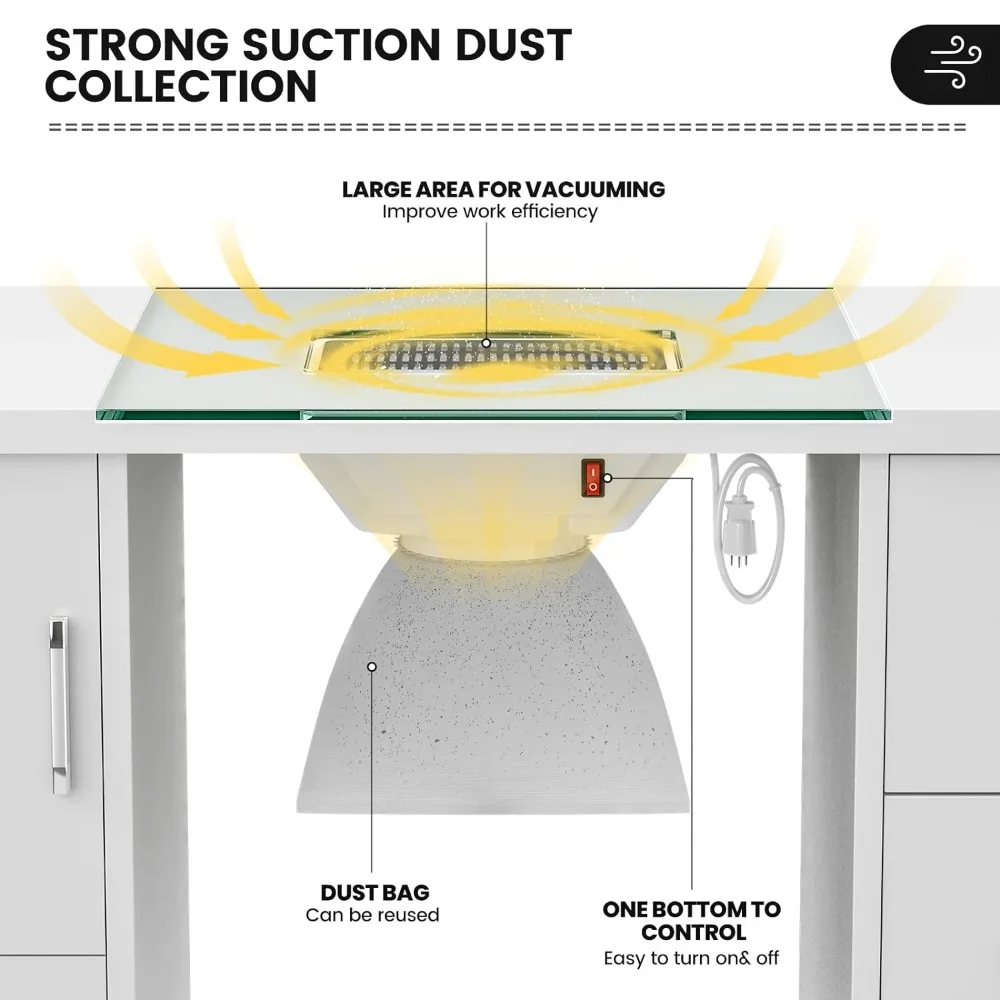 Esta mesa de uñas profesional con diseño presenta una tabla de densidad y una mesa de vidrio., Piernas de metal y manijas de metal con un aspecto elegante, con un coleccionista de polvo eléctrico, y muñequeras. Se puede usar en salones, salones de uñas, técnicos de uñas, spas, etc..
