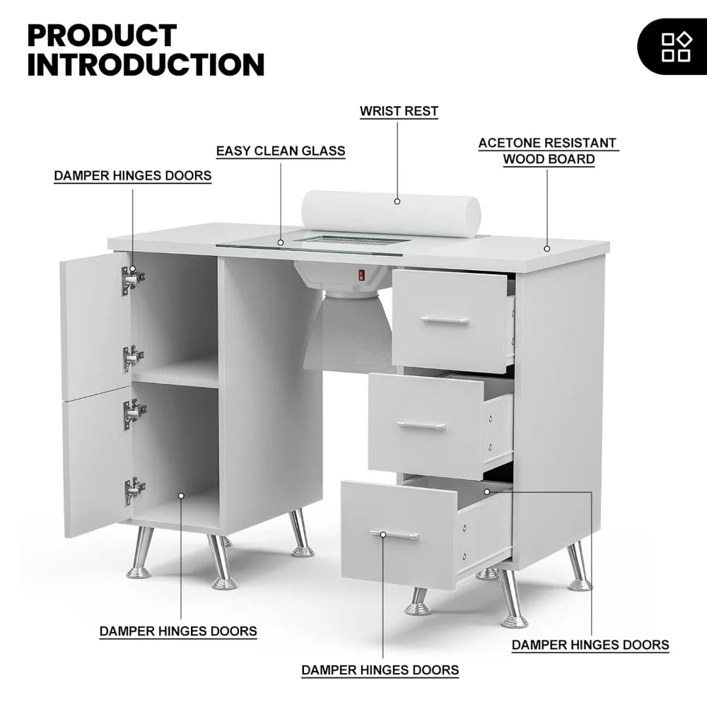 - 【Fuerte colector de polvo de succión】 Esta mesa de manicura con una aspiradora incorporada ultra-secuencia ayuda a capturar los desorden y los olores creados al pulir y llenar las uñas, evitando que usted y sus clientes los inhalen. La aspiradora es simple y fácil de usar, con un botón que puede controlar.