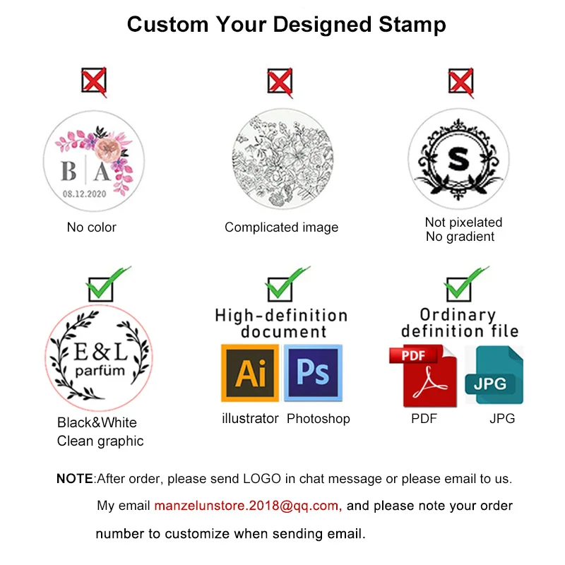 Proporcione un patrón personalizado al vendedor dentro de 7 días después de la compra cuando quieras personalizar tu patrón, si no se ha contactado al vendedor para enviar un LOGO personalizado, el valor predeterminado envía un sello en blanco.