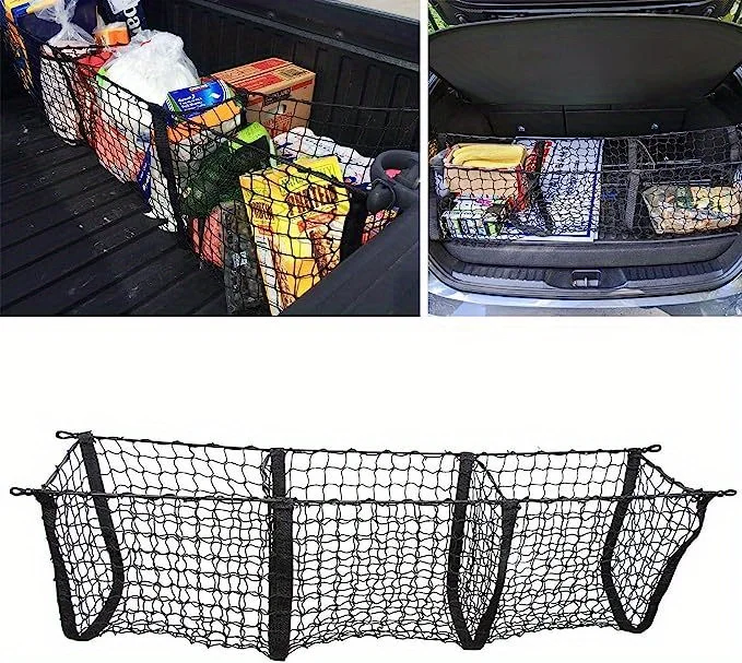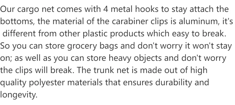 This content discusses a pocket cargo net designed for pickup truck beds, SUV, and cars. It comes with heavy-duty 4 metal carabiners for secure attachment. The cargo net is designed to keep items in place while driving and prevent shifting or sliding in the bed of the truck. It is suitable for various vehicles and provides a convenient solution for organizing and securing cargo during transportation.