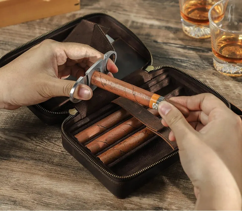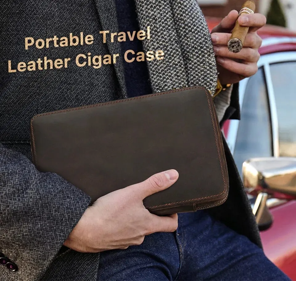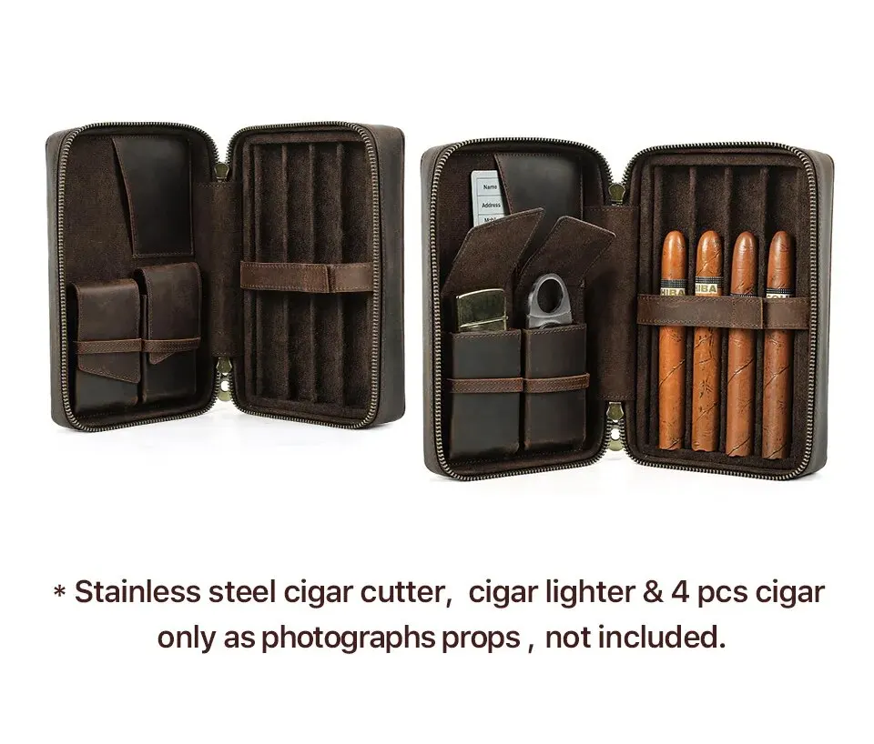 Vintage Genuine Leather Cigar Humidor Box Travel Storage Case for 4 Cigars Accessories Lighter Cigar Cutter Humidifier Bag