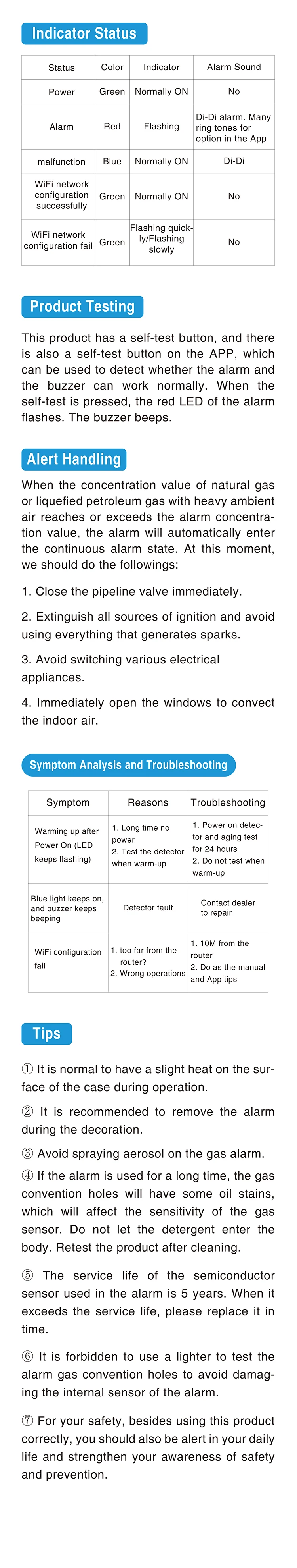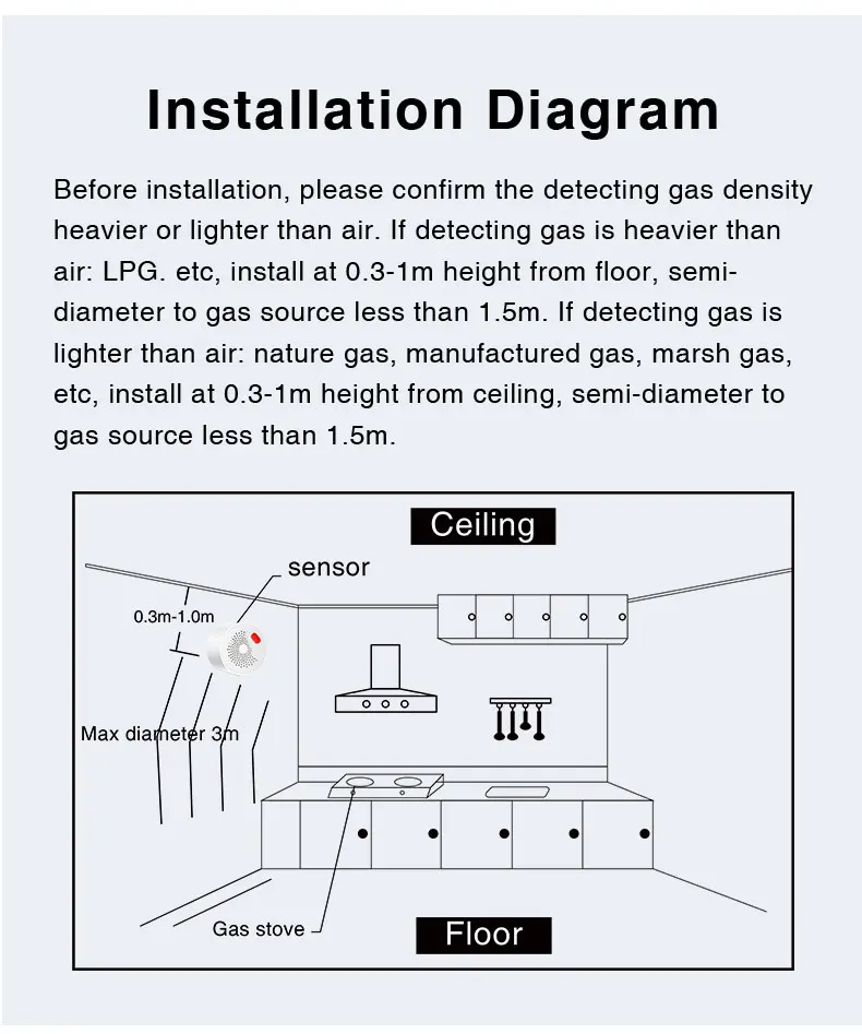 【Alarma】 Cuando se detecta gas, Este sensor de alarma emite una fuerte alarma para alertarlo a usted y a su familia sobre el peligro potencial..