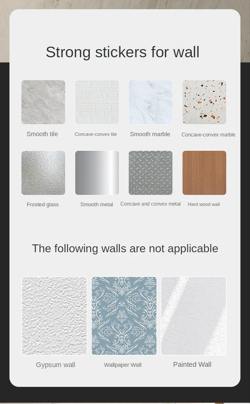 1.Estos funcionan solo en no poroso,superficies lisas como baldosas de cerámica pulida,espejo, ventana de vidrio, inoxidable pulido