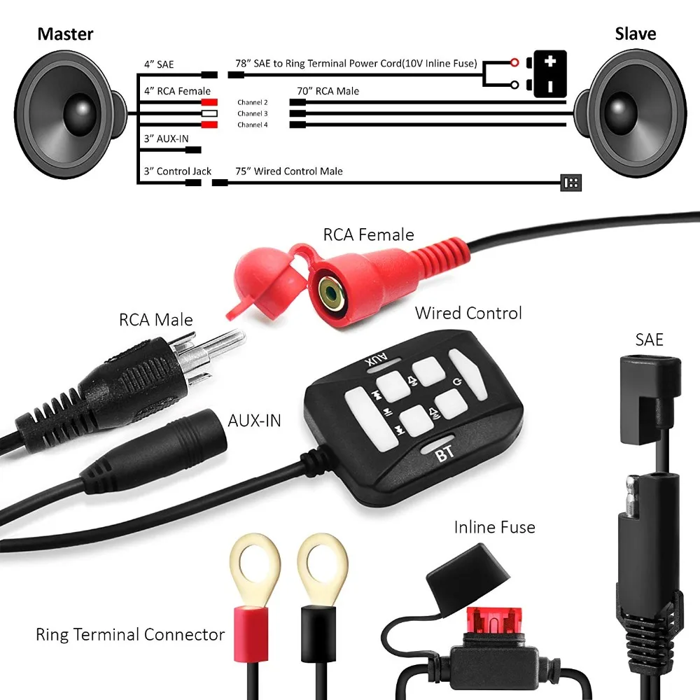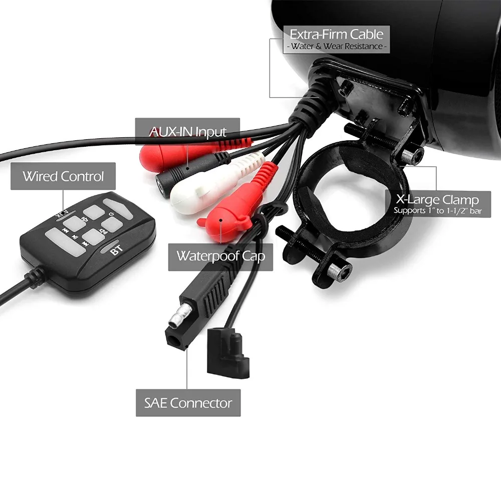 >>Excelente calidad de sonido de cristal. Diseño impermeable IP56 avanzado. Ideal para uso al aire libre. Included full function wired control. Fácil instalación: Included SAE to Ring Terminal Connector Power Cord. Viene con todo el hardware y el cableado necesarios. Conectar y usar. Conexión de potencia estándar de 12V.
