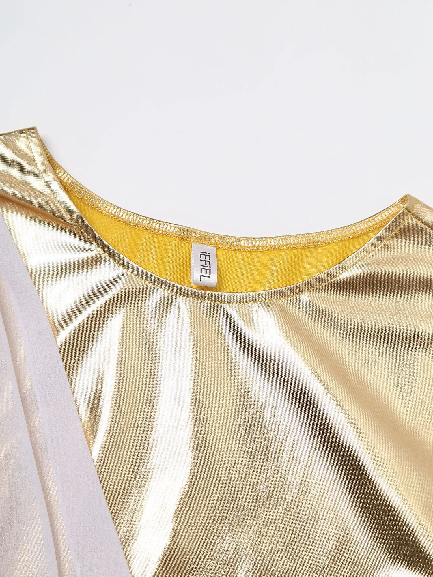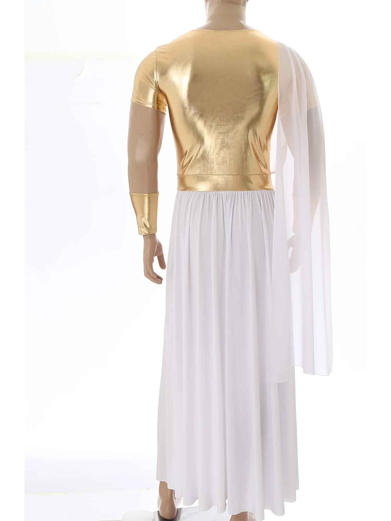 Men’s ancient Geek tunic is designed with short sleeve, chiffon layer from front to right shoulder, metallic shiny upper body.