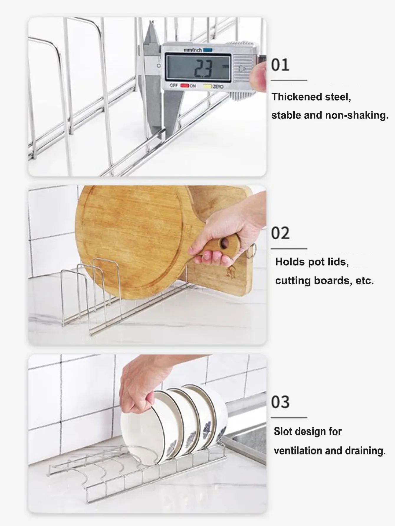 1-2Supports de rangement de plats de cuisine en acier inoxydable, support de bol de séchage, couvercle de Pot, étagère de casserole, égouttoir, accessoires de cuisine