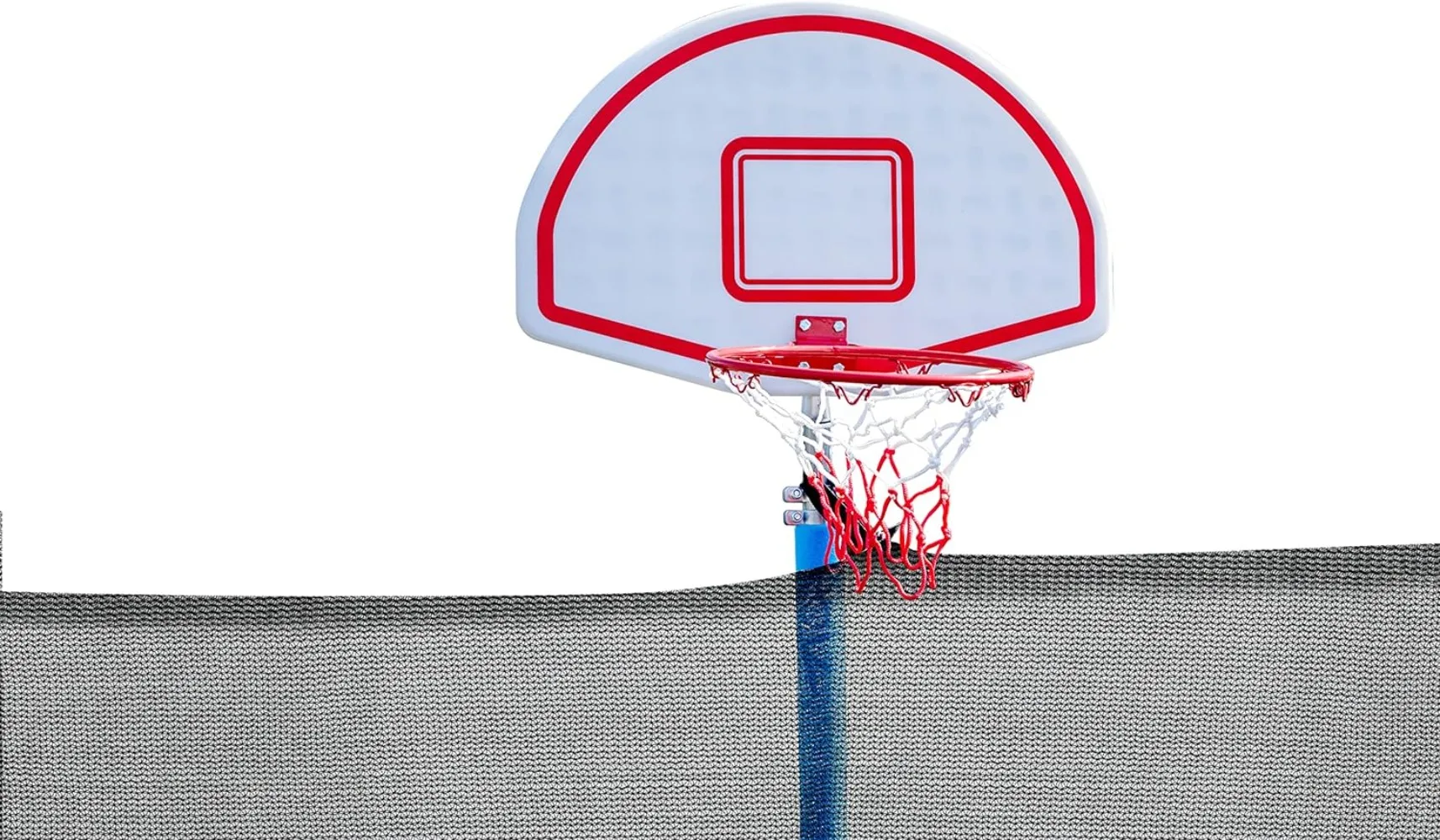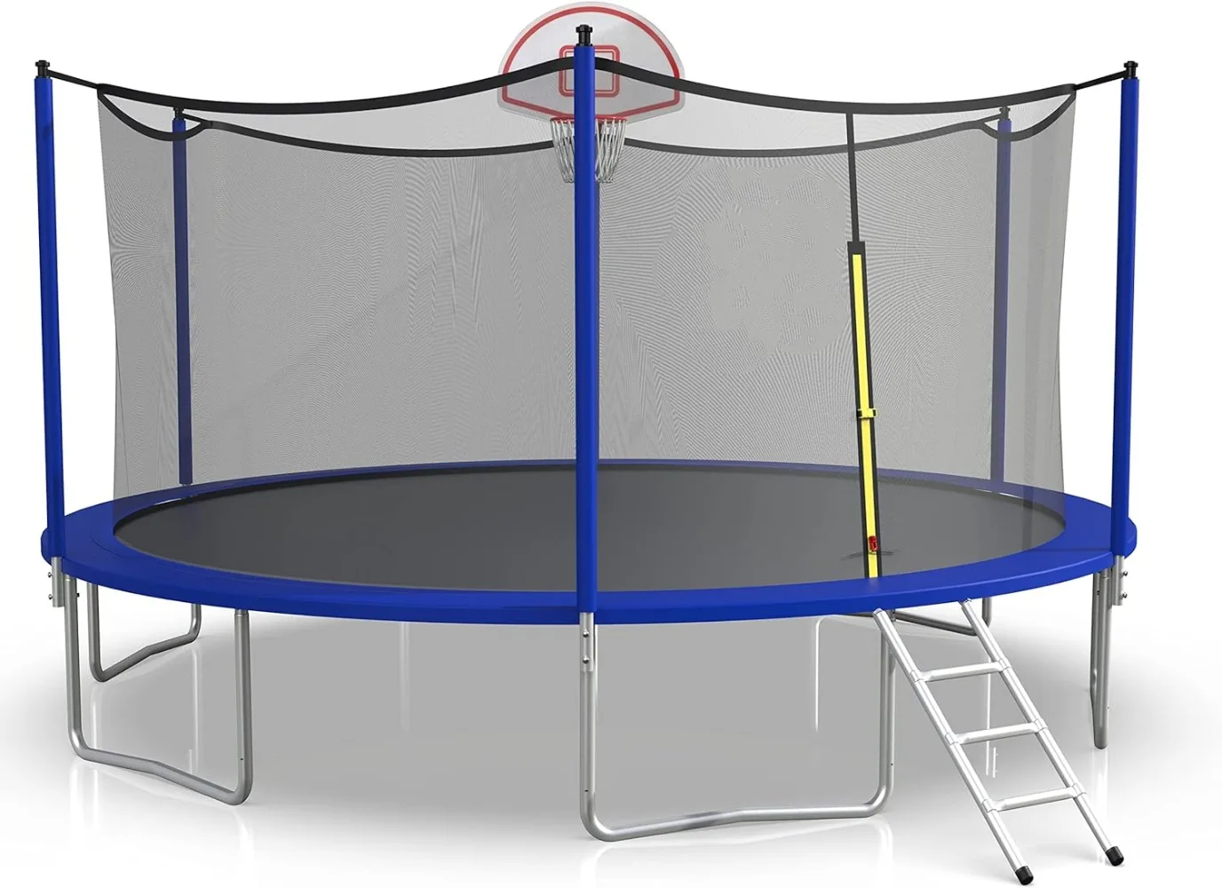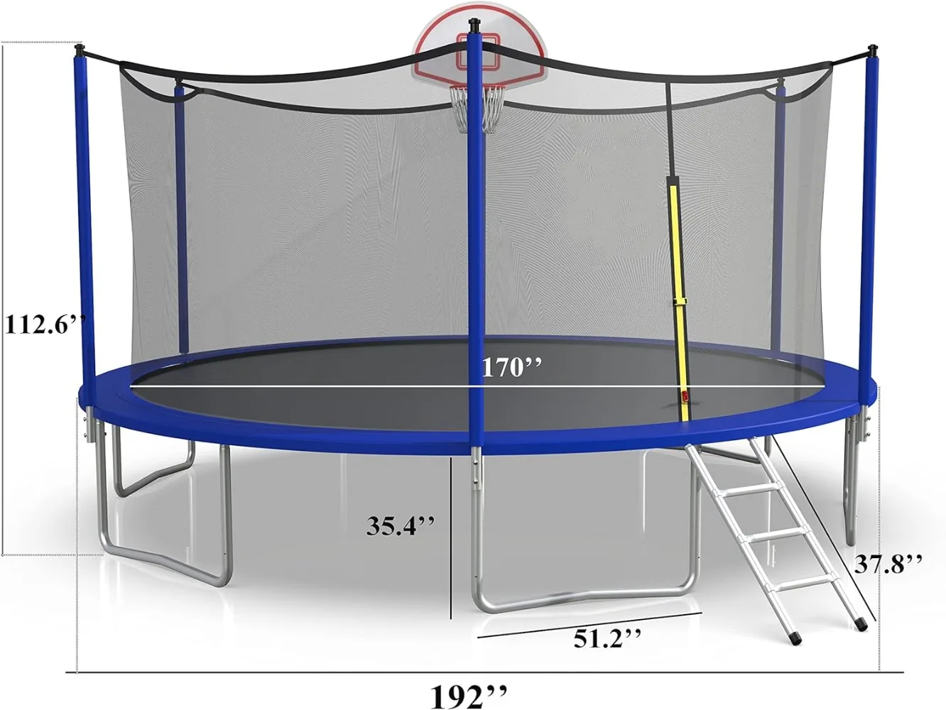 Le contenu décrit un 16, 15, 14, 12, and 10-foot trampoline with various features such as a basketball hoop, glisser, and swings. This outdoor trampoline also includes a safety enclosure to prevent accidents while jumping. These trampolines are designed for recreational use and provide a fun and interactive way for individuals to exercise and play outdoors. The addition of the basketball hoop, glisser, and swings adds extra entertainment options for users. Dans l'ensemble, this product offers a combination of both safety and enjoyment for users of all ages.