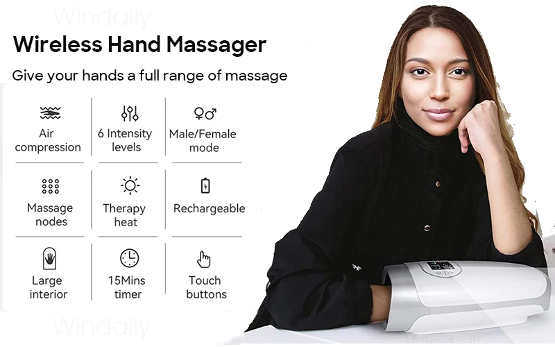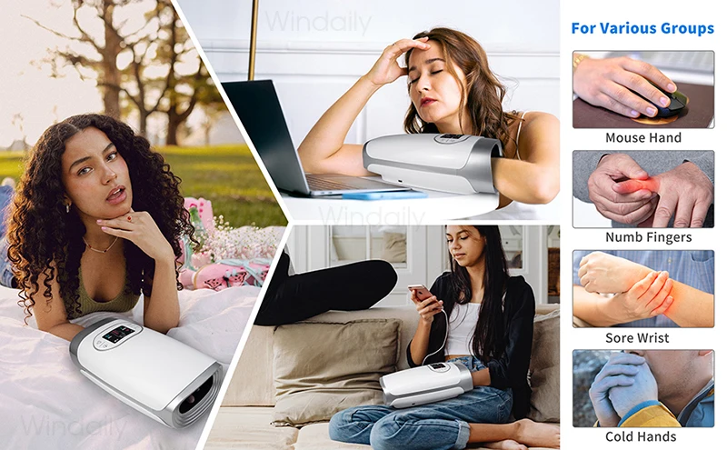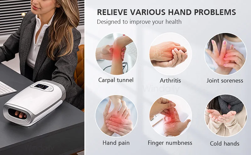This portable hand massager is designed to alleviate joint pain, finger numbness, and carpal tunnel pain. It works by kneading hand acupoints and joints through airbag massage, while heat therapy promotes blood circulation and relaxes the hands.