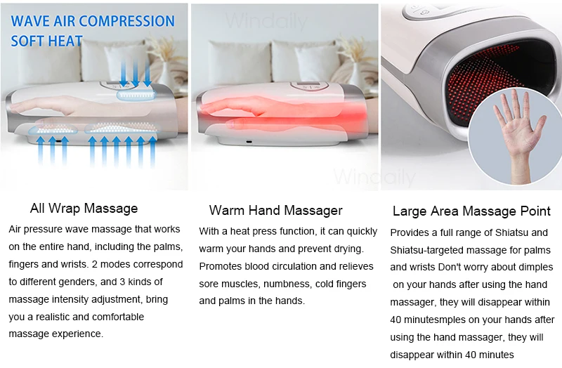 This hand massager includes a heat press function to quickly warm up the hands and prevent dryness. It helps promote blood circulation and alleviate sore muscles, engourdissement, cold fingers, and palms.