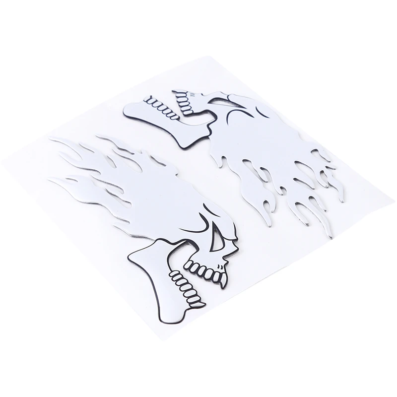 Un ensemble de 2 silver chrome ghost skull head stickers for cars and motorcycles. These 3D decals are great for adding a spooky Halloween theme to your vehicle. They are easy to apply and are perfect for car styling and decoration. The decals are durable and will last a long time on your vehicle. Add a touch of Halloween spirit to your car with these unique and eye-catching stickers.