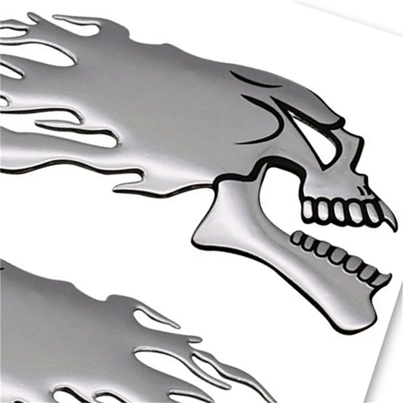 Un ensemble de 2 silver chrome ghost skull head stickers for cars and motorcycles. These 3D decals are great for adding a spooky Halloween theme to your vehicle. They are easy to apply and are perfect for car styling and decoration. The decals are durable and will last a long time on your vehicle. Add a touch of Halloween spirit to your car with these unique and eye-catching stickers.