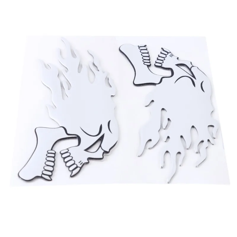 Un ensemble de 2 silver chrome ghost skull head stickers for cars and motorcycles. These 3D decals are great for adding a spooky Halloween theme to your vehicle. They are easy to apply and are perfect for car styling and decoration. The decals are durable and will last a long time on your vehicle. Add a touch of Halloween spirit to your car with these unique and eye-catching stickers.
