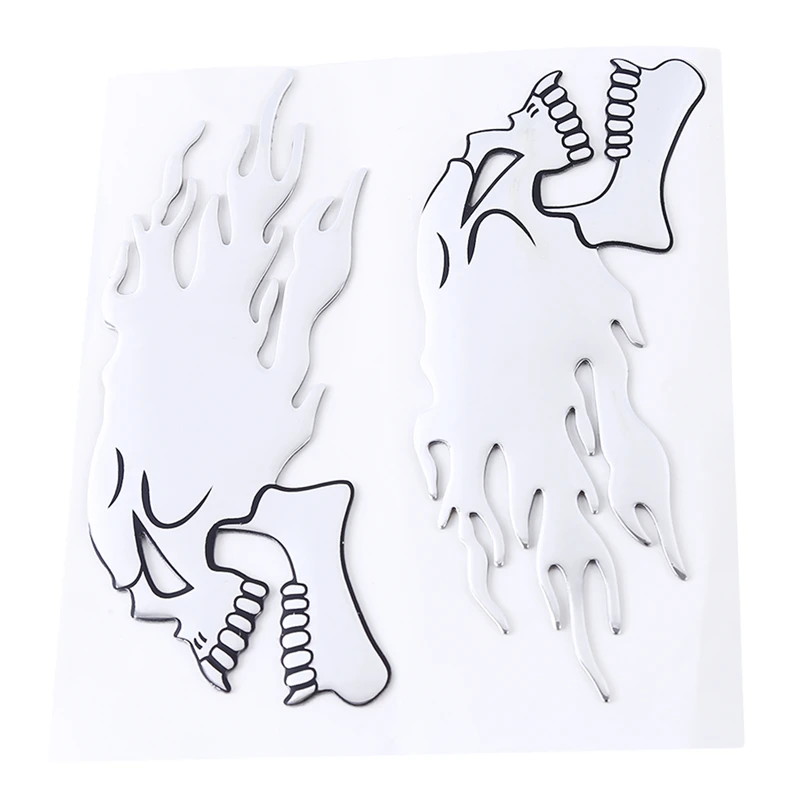 Un ensemble de 2 silver chrome ghost skull head stickers for cars and motorcycles. These 3D decals are great for adding a spooky Halloween theme to your vehicle. They are easy to apply and are perfect for car styling and decoration. The decals are durable and will last a long time on your vehicle. Add a touch of Halloween spirit to your car with these unique and eye-catching stickers.