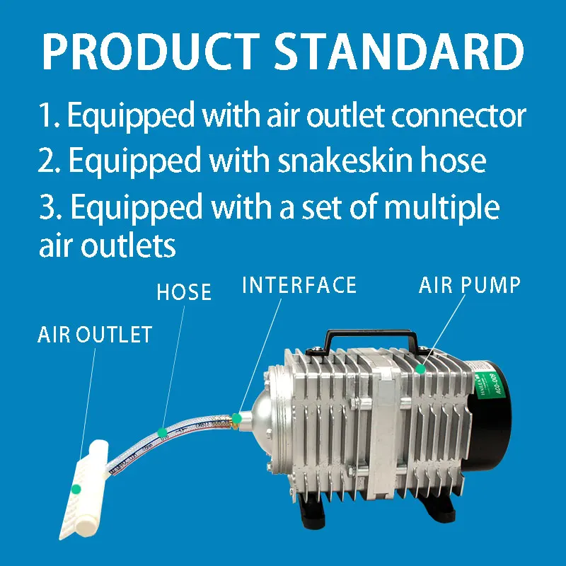 This content is about an electromagnetic air compressor pump with different speed options of 45L/min, 55L/min, and 70L/min. The pump can be used for various purposes such as oxygenating aquariums, étangs de poisson, et les systèmes hydroponiques. It functions as an air aerator pump to provide proper aeration for the aquatic environment.