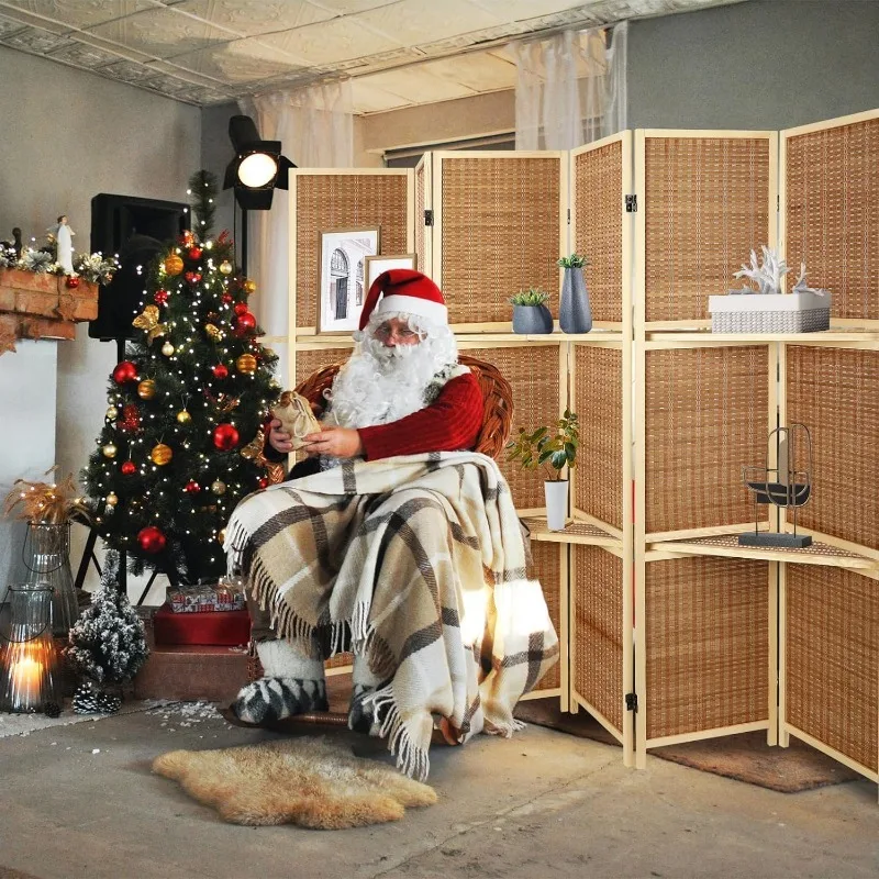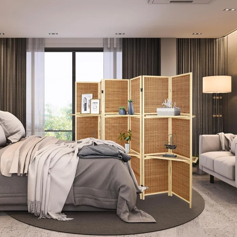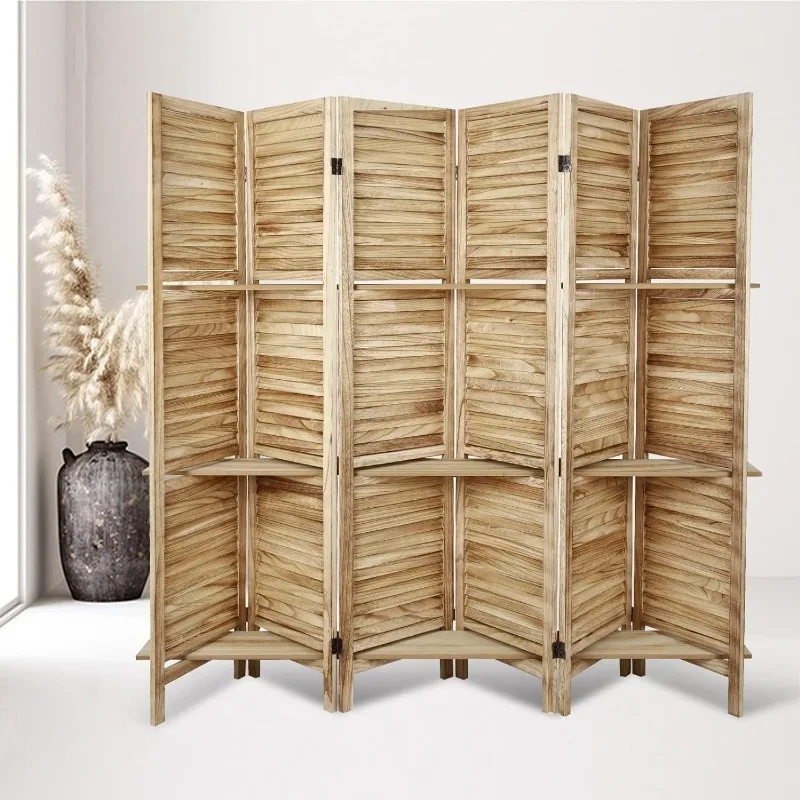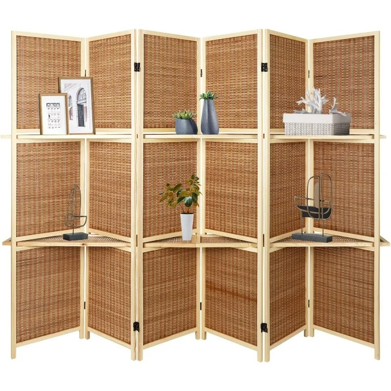 Le 6 Le séparateur de pièce à panneaux est un séparateur en bois pliable entièrement assemblé qui comprend également des étagères pour plus de fonctionnalité.. Il peut être utilisé comme séparateur de pièce ou comme paravent pliable pour créer des espaces séparés dans une pièce.. Cette cloison est robuste et polyvalente, ce qui en fait un ajout pratique à toute maison ou bureau. Sa conception pliable permet une installation et un transport faciles, tandis que les étagères offrent un espace de rangement pour exposer des décorations ou organiser des objets.. Dans l'ensemble, ce séparateur de pièce offre à la fois fonctionnalité et style pour diviser les espaces et ajouter de l'intimité.