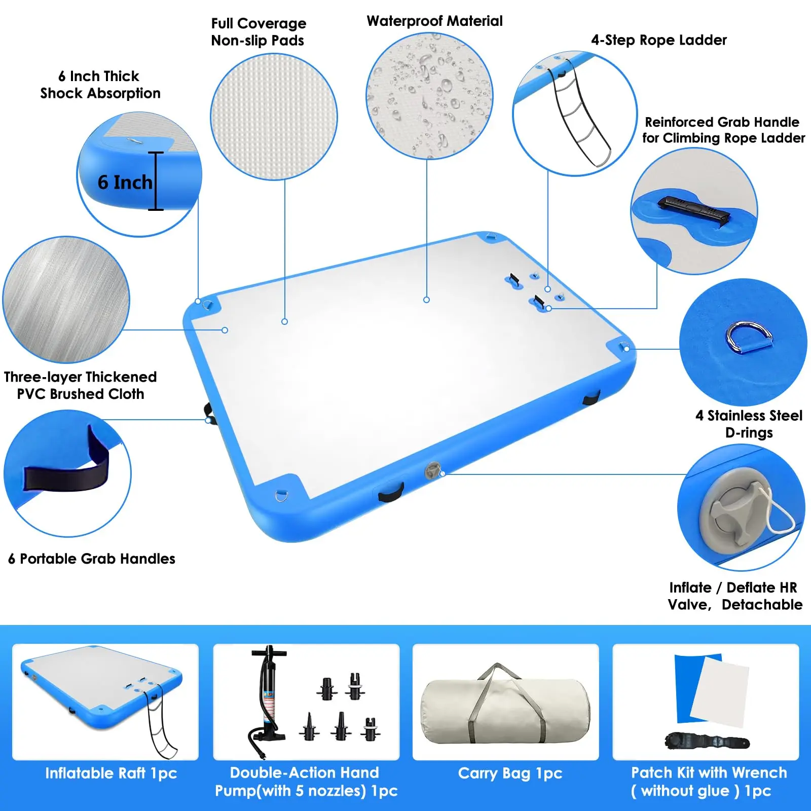 【SIZE & LOAD-BEARING】The inflatable dock platform is 6 inches thick and has a variety of sizes. 6 ft*6 ft , peut accueillir 3-5 personnes, weighs about 800 Kg. 8 ft*6 ft , peut accueillir 4-6 personnes, weighs about 1000 Kg. 10 ft*6 ft , peut accueillir 5-7 personnes, weighs about 1200 Kg. 12 ft*6 ft , peut accueillir 6-9 personnes, weighs about 1400 lbs.【6 months manufacturer’s warranty. Toutes les questions, please feel free to contact us.】