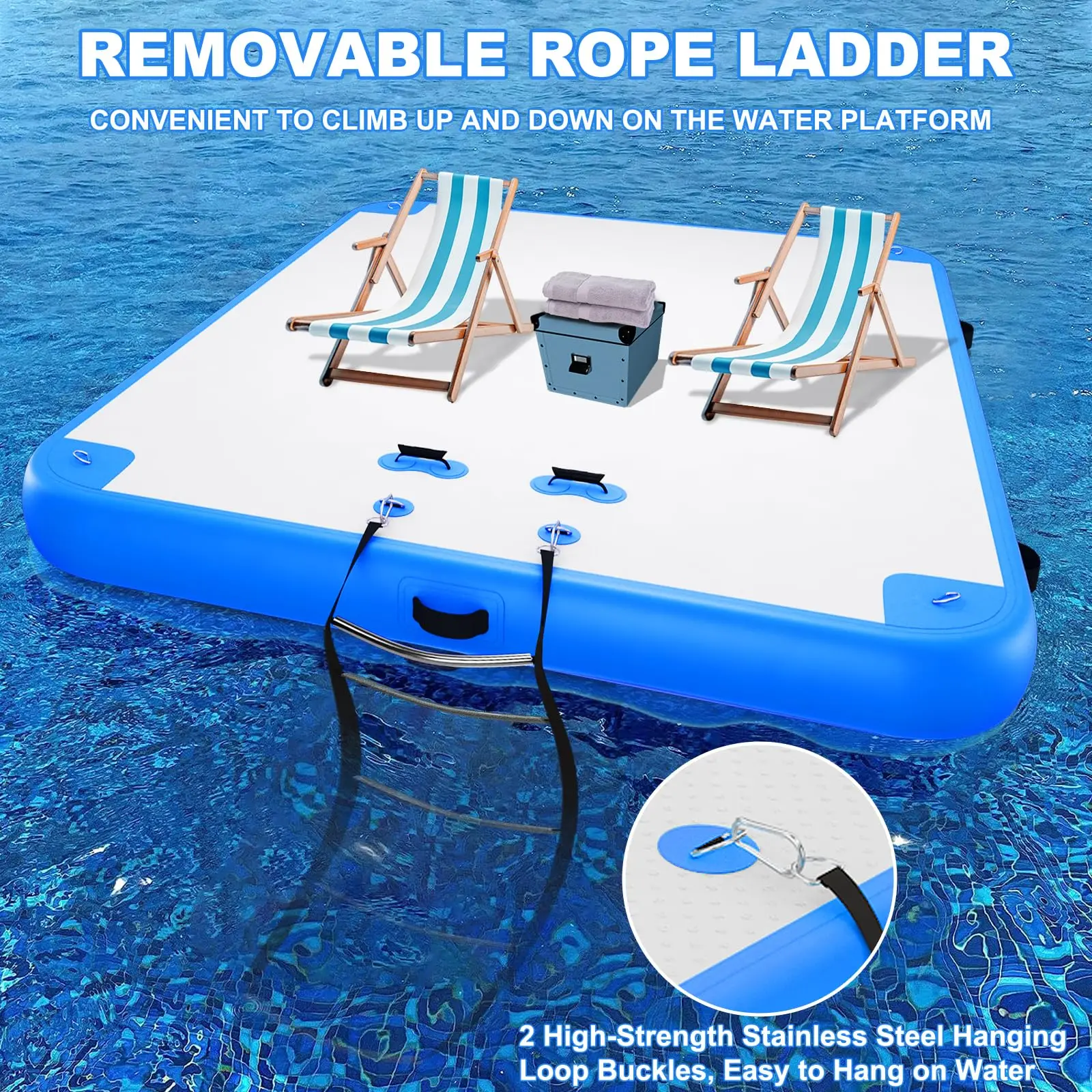 【LARGE INFLATABLE DOCK】The Inflatable floating dock serve as a floating resort. Comfortably holds 4 à 8 people and over 1200 livres de poids. You can add coolers, chaises, and umbrellas to it for swimming, plongée en apnée, yoga, lake lounging, or tanning. The floating dock is made of 3 layer 1.2mm thickened PVC brushed cloth and non-slip pads with double-reinforced seams for incredible durability. Never worry about your fun ending with damage.