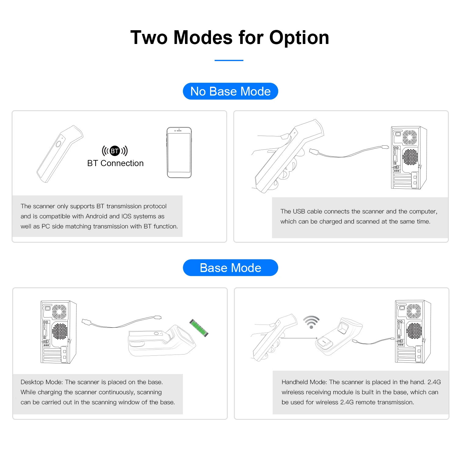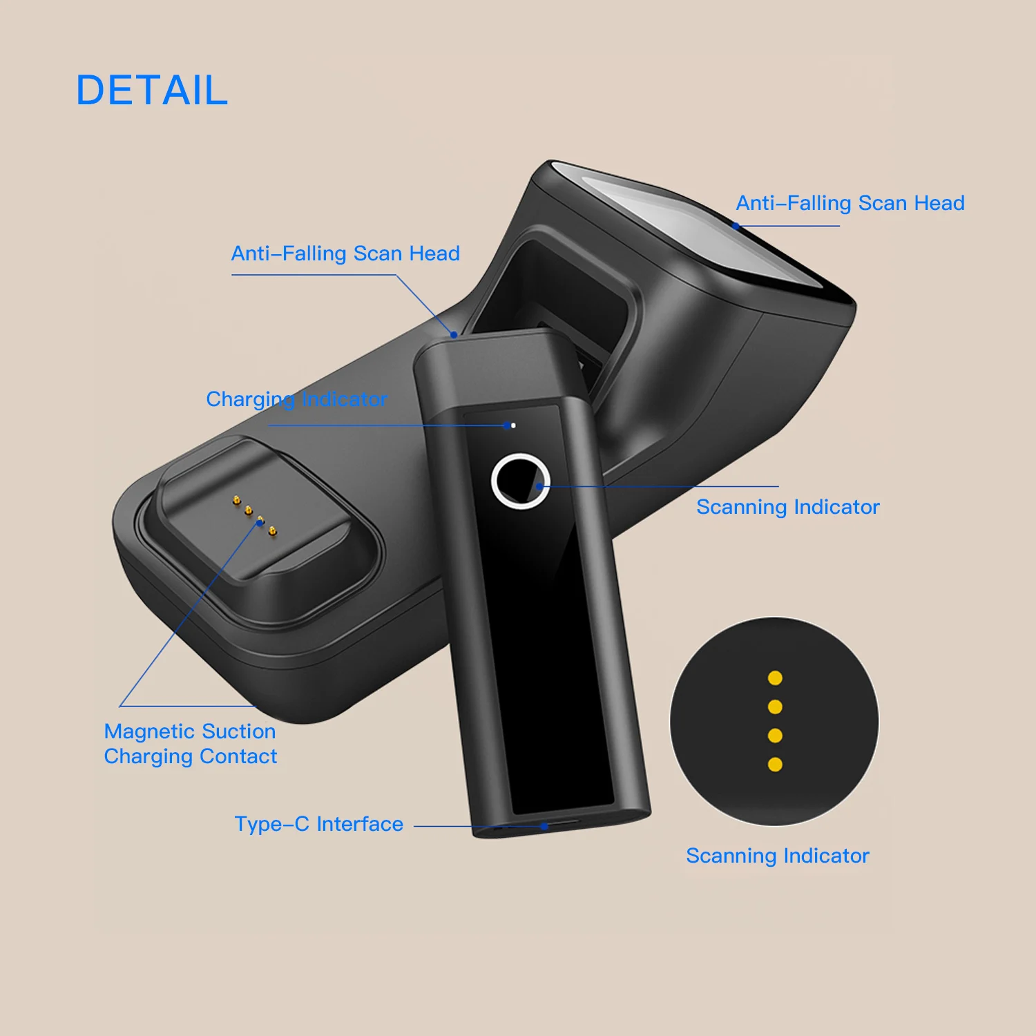 Come with an multi-functional base, which can be used as a barcode scanner or charging station, easy to operate and convenient to use.
