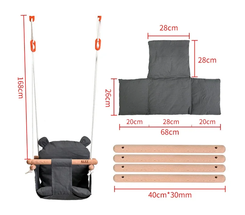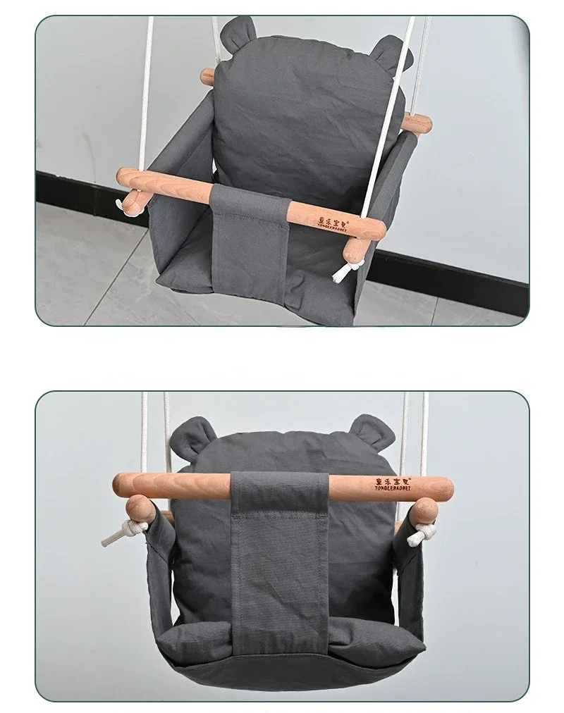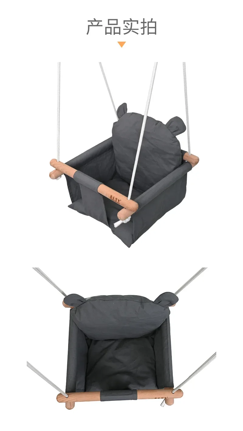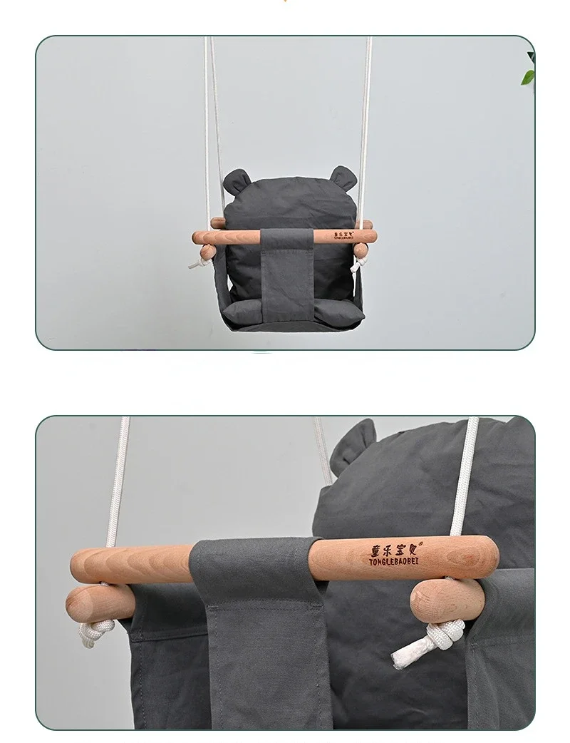 The content describes a baby canvas swing chair made of hanging wood, suitable for children in kindergartens to play indoors or outdoors. The small beige basket acts as a swinging rocking chair and is designed as a baby toy. The swing chair is specifically designed for babies, providing a safe and entertaining way for them to play and relax. It is a suitable addition to any nursery or play area, allowing children to enjoy swinging and rocking in a comfortable and secure manner.