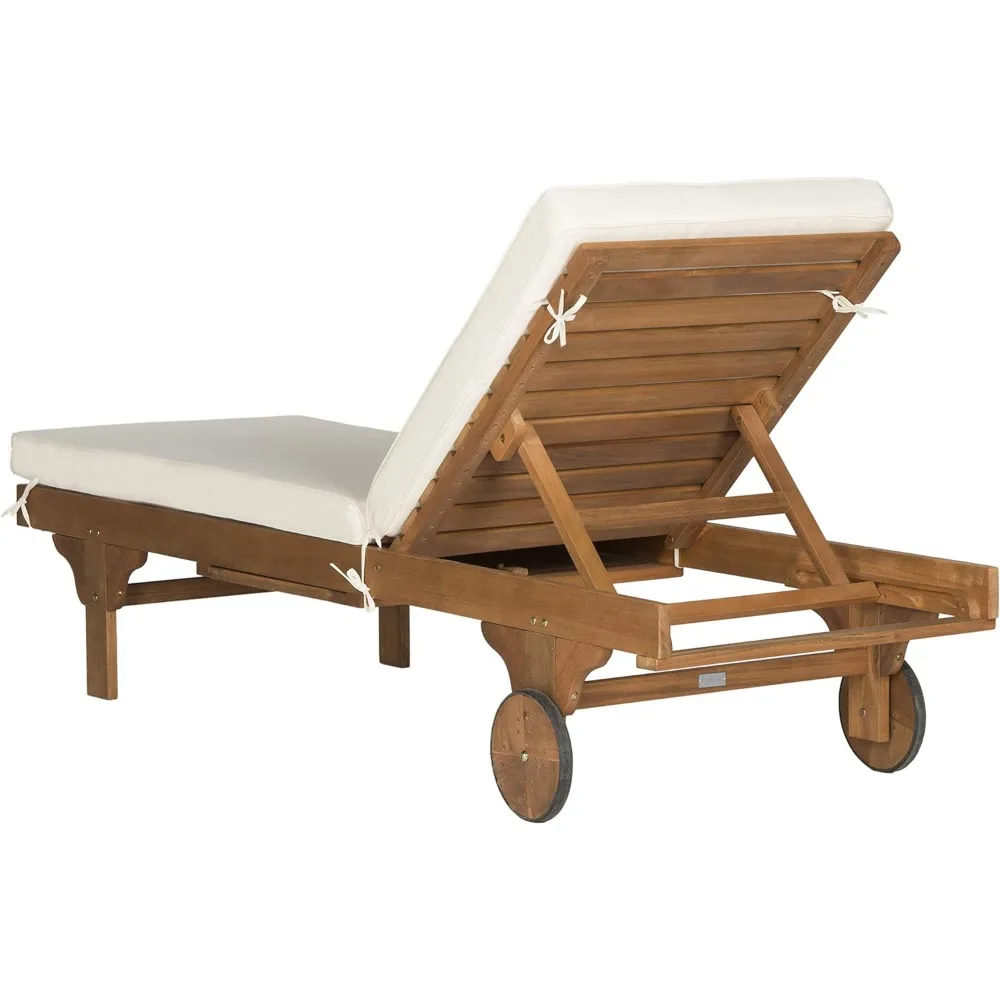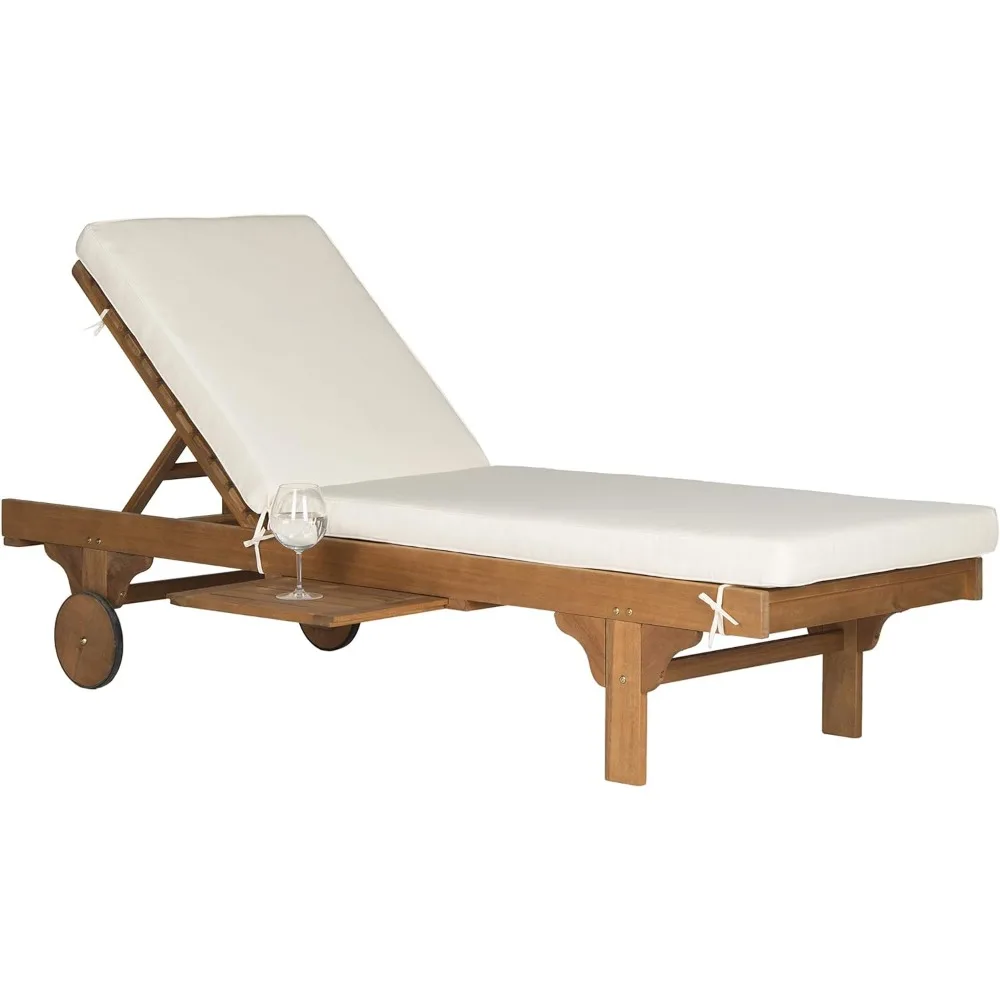 A transitional update of a cruise ship classic, the Newport outdoor chaise lounge chair recalls dreamy days on a transatlantic crossing with its beige fabric and brown finish on eucalyptus wood. Carved front legs and back wheels allow for easy mobility, and a sliding table is perfect for holding your refreshing drinks.