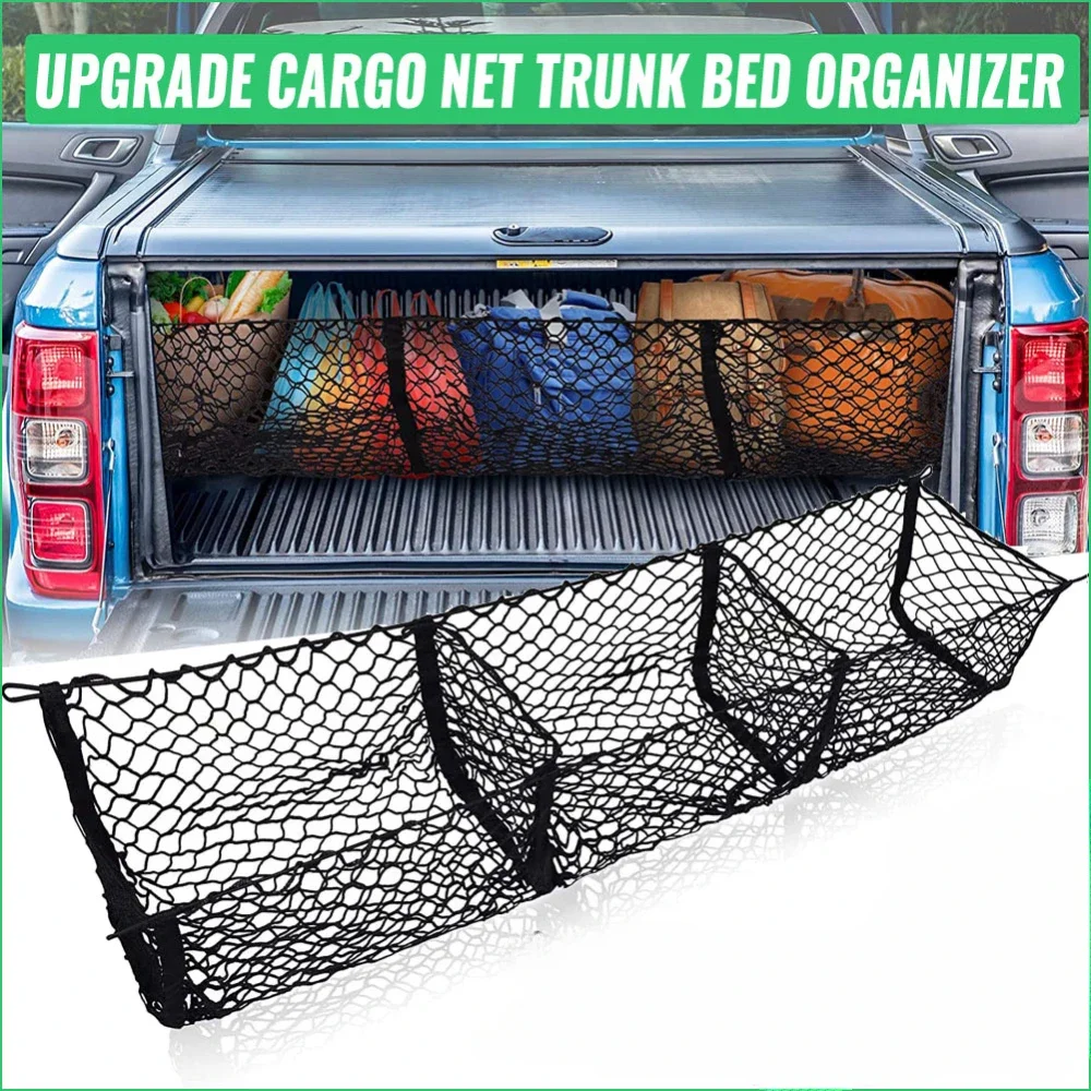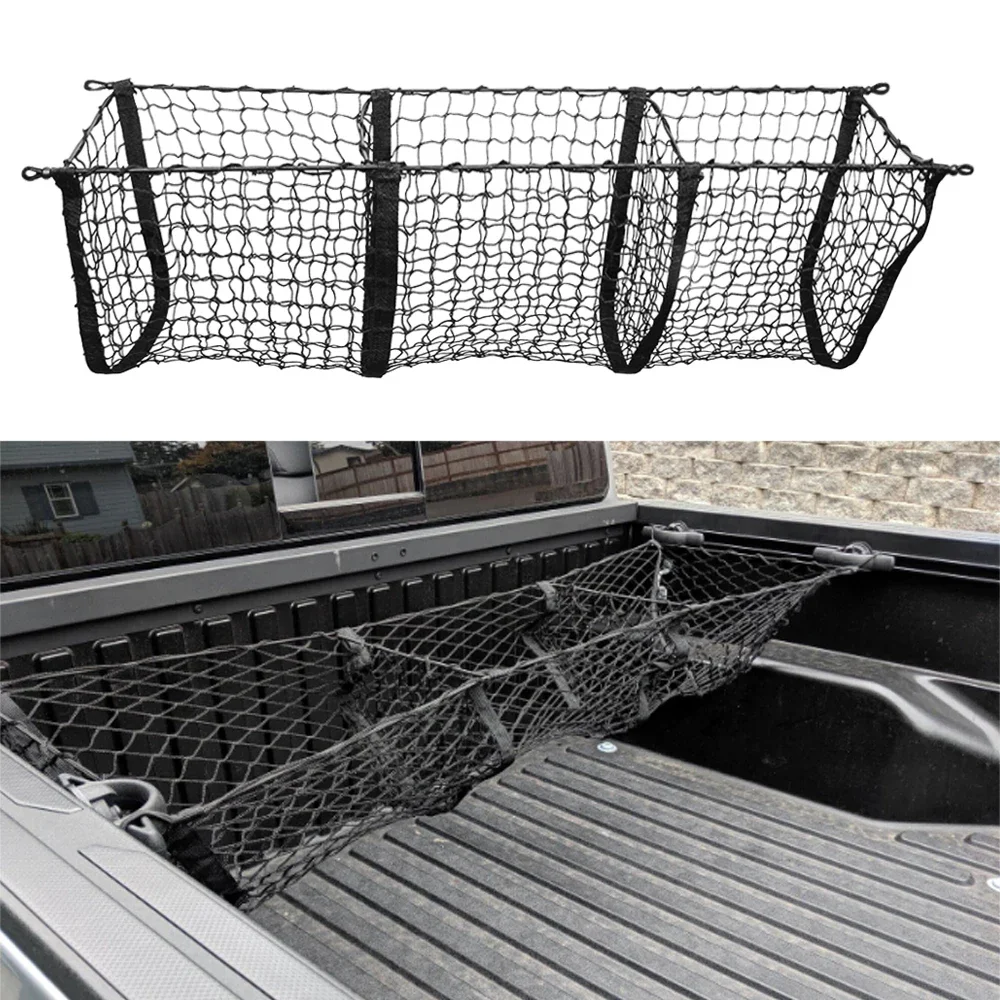 A cargo net specifically designed for pickup truck beds, this product is a trunk cargo storage organizer that helps keep items secure while driving. Made of mesh material, the cargo net is durable and suitable for storing various items in the truck bed. This interior accessory helps to keep the truck bed organized and prevents items from shifting or falling out during transit. The set includes a mesh cargo net and other rear storage accessories. Perfect for those who need to transport items in their pickup truck bed securely and efficiently.