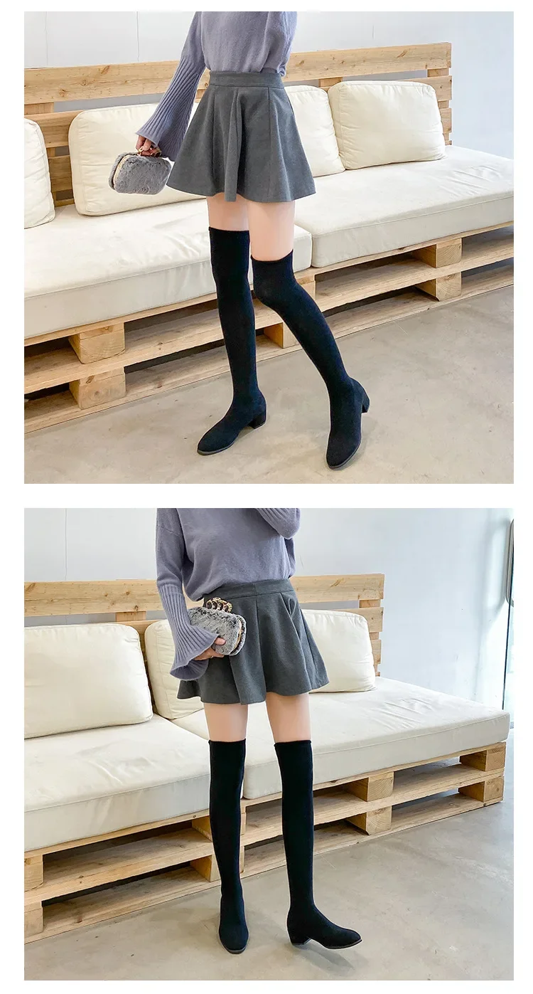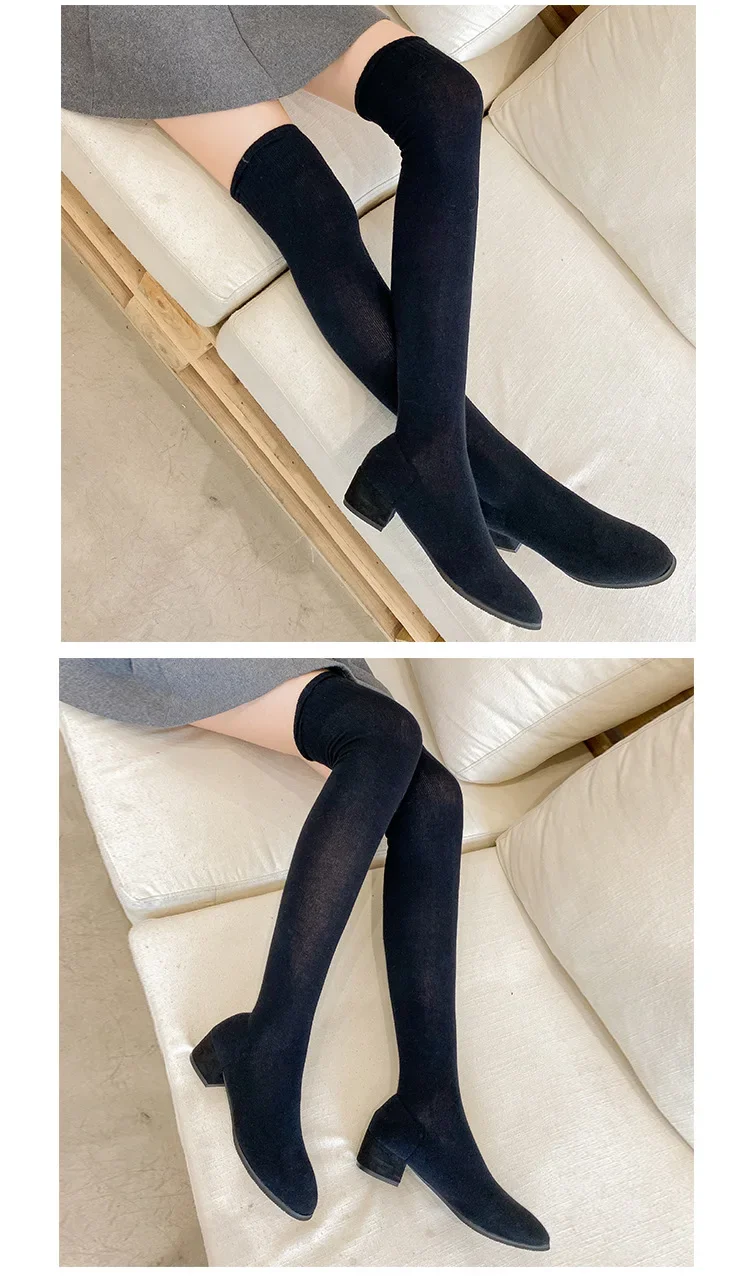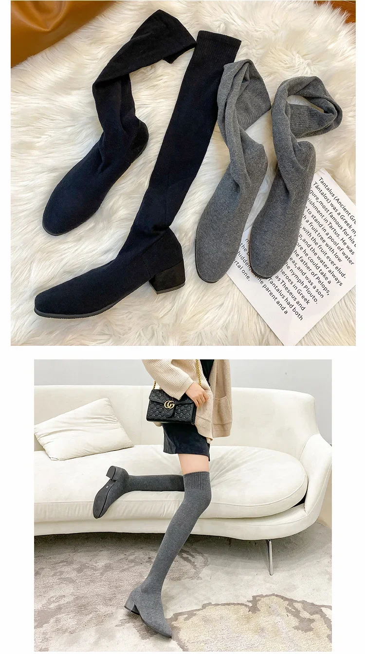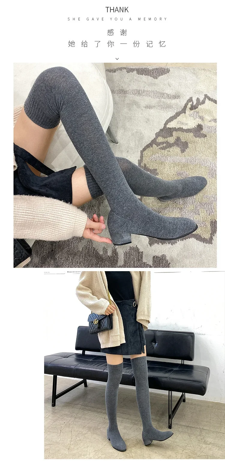Célébrez les femmes’s printemps automne longtemps au-dessus du genou dames élastiques carrées basses basses femme stretch chaussures sexes bottes de chaussettes hautes