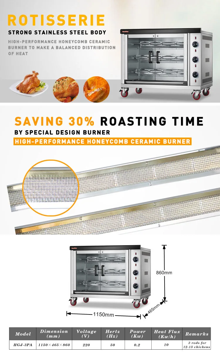 Que vous’re looking to add a new item to your menu or upgrade your current rotisserie grill, our Commercial Large Gas Electric Chicken Roaster Rotisseries Grill is the perfect choice. Invest in this reliable and efficient cooking equipment to elevate your culinary offerings and satisfy the taste buds of your customers. Order yours today and start cooking up delicious rotisserie chicken with ease.