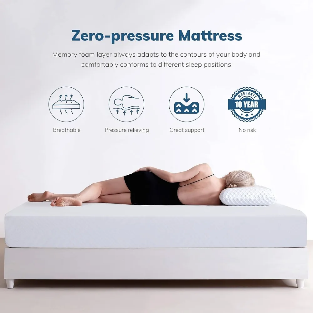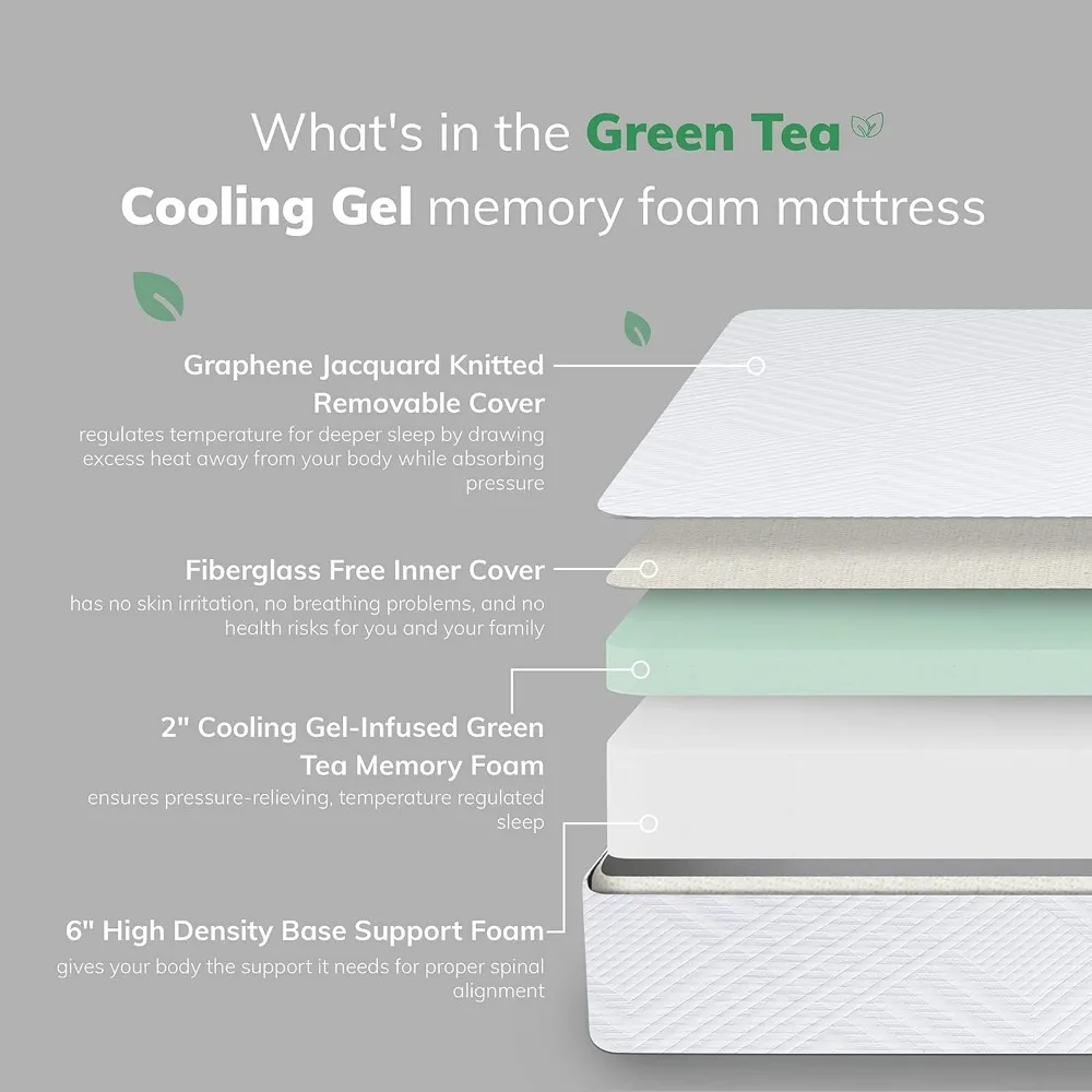 - 【Internally and Externally Breathable】Cooling gel-infused green tea memory foam ensures pressure-relieving, temperature regulated sleep. Refreshing Green Tea Gel offers good airflow, dissipates heat, and wicks away excess moisture away from the body. This best mattress keep you cool and actively regulate temperature throughout the night while its premium green tea infusion promises a clean feeling night after night.