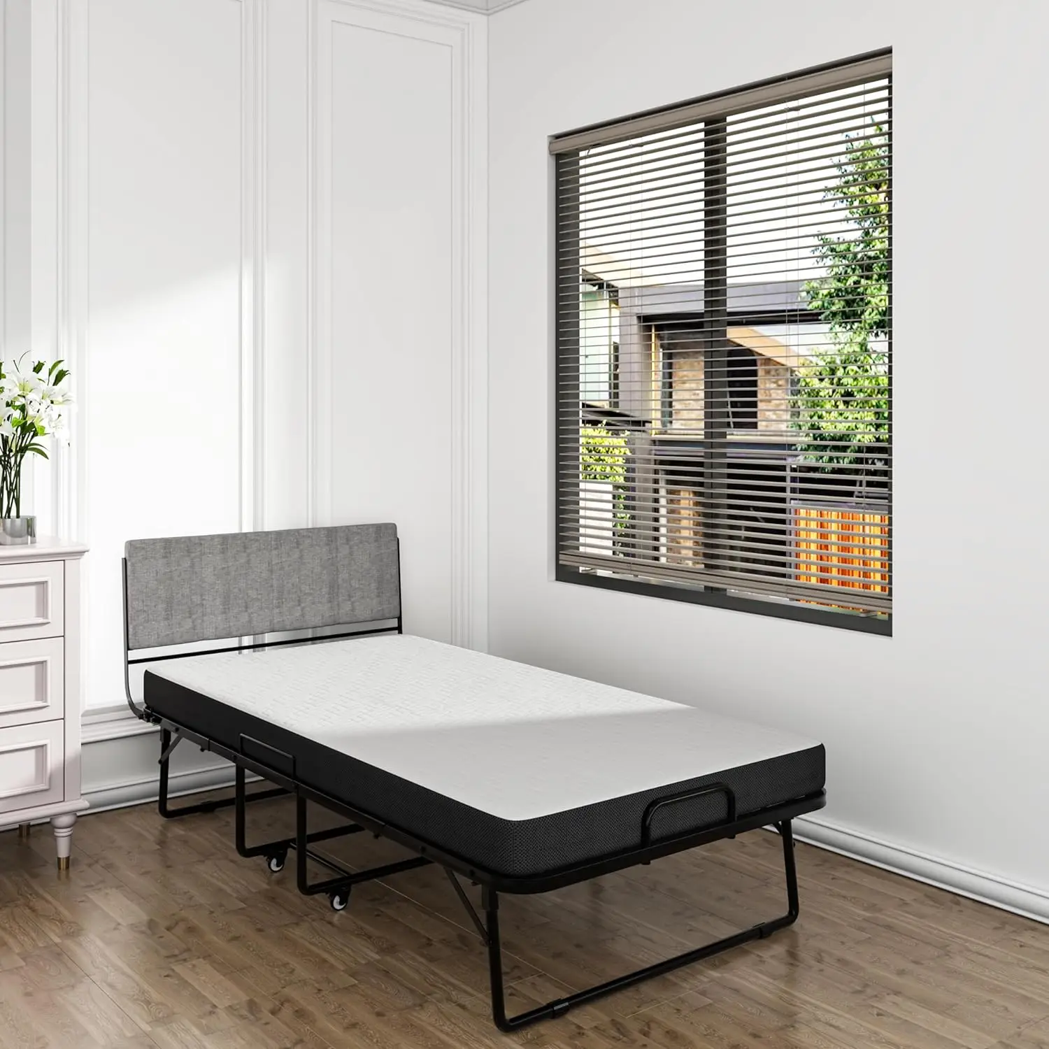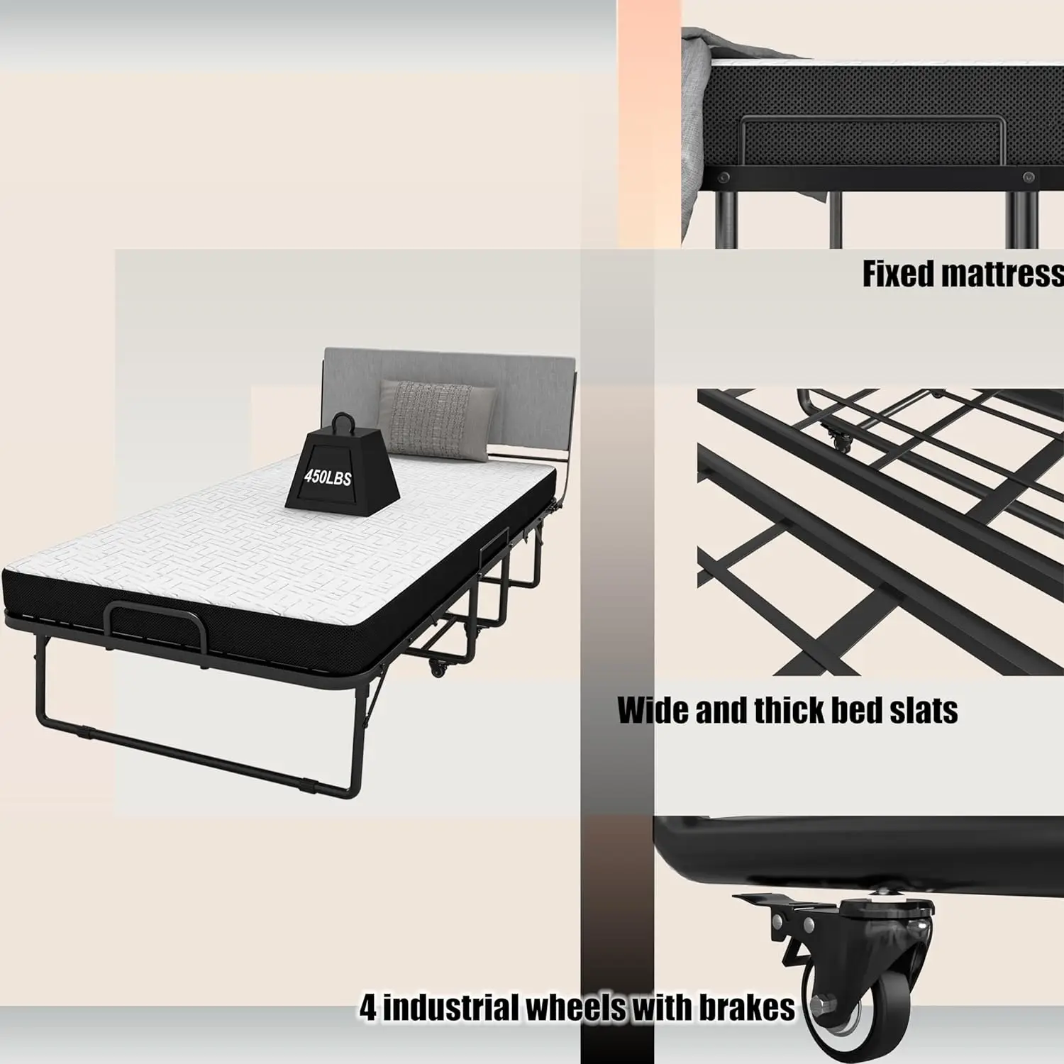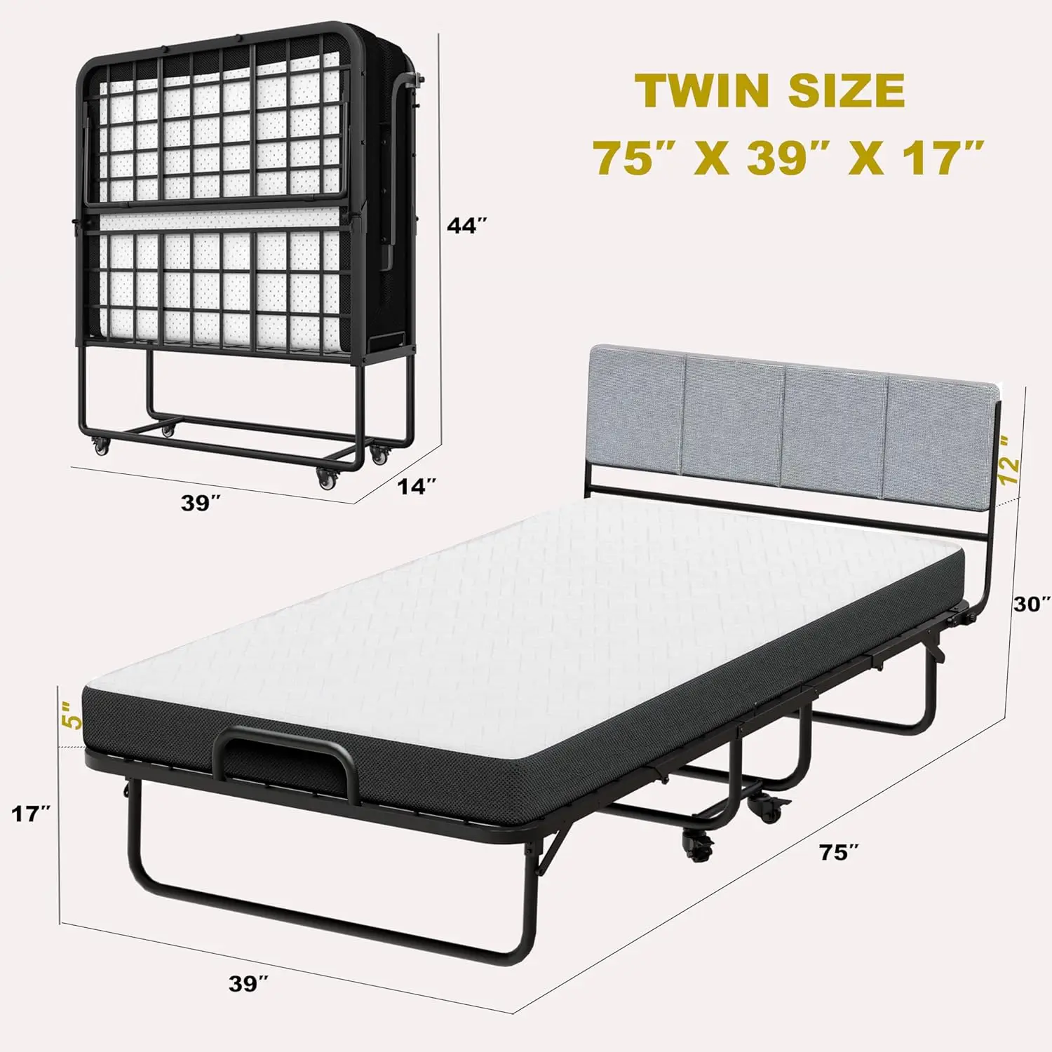 Lit pliant avec 5″ Matelas en mousse à mémoire, 75″ X 39″ Twin Guest Bed with Headboard, Portable Rollaway Bed with Sturdy Frame, Home Camping Office Vacation Nursing