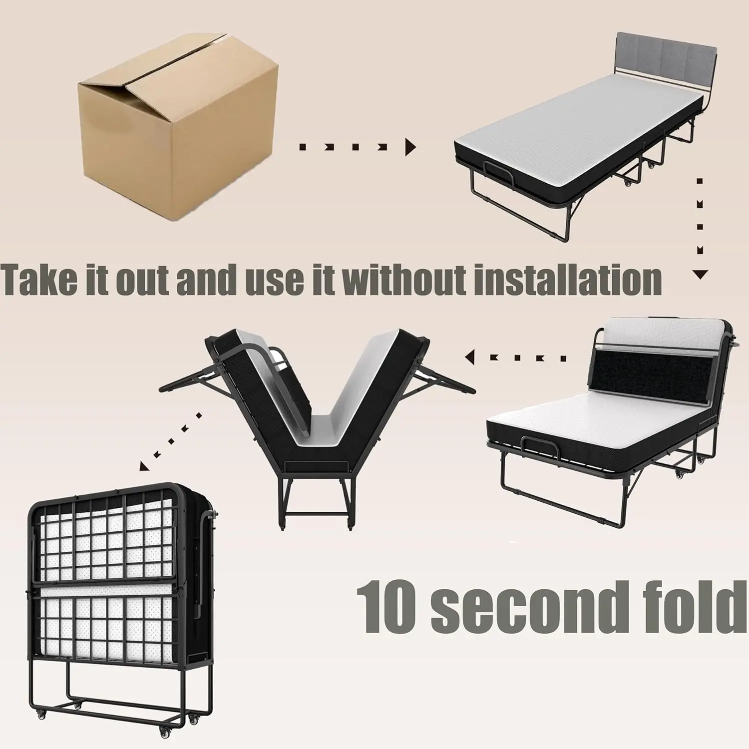 - 【Without Installation & Easy Folding】Take out the foldable bed, unfold it in 10 secondes, and you can use it. The four sturdy industrial wheels make it easier and smoother to move the bed frame. When the wheels are locked, the foldaway guest bed no longer shakes. The headboard is also easy to fold, there is no need to tuck the head of the bed under the mattress.