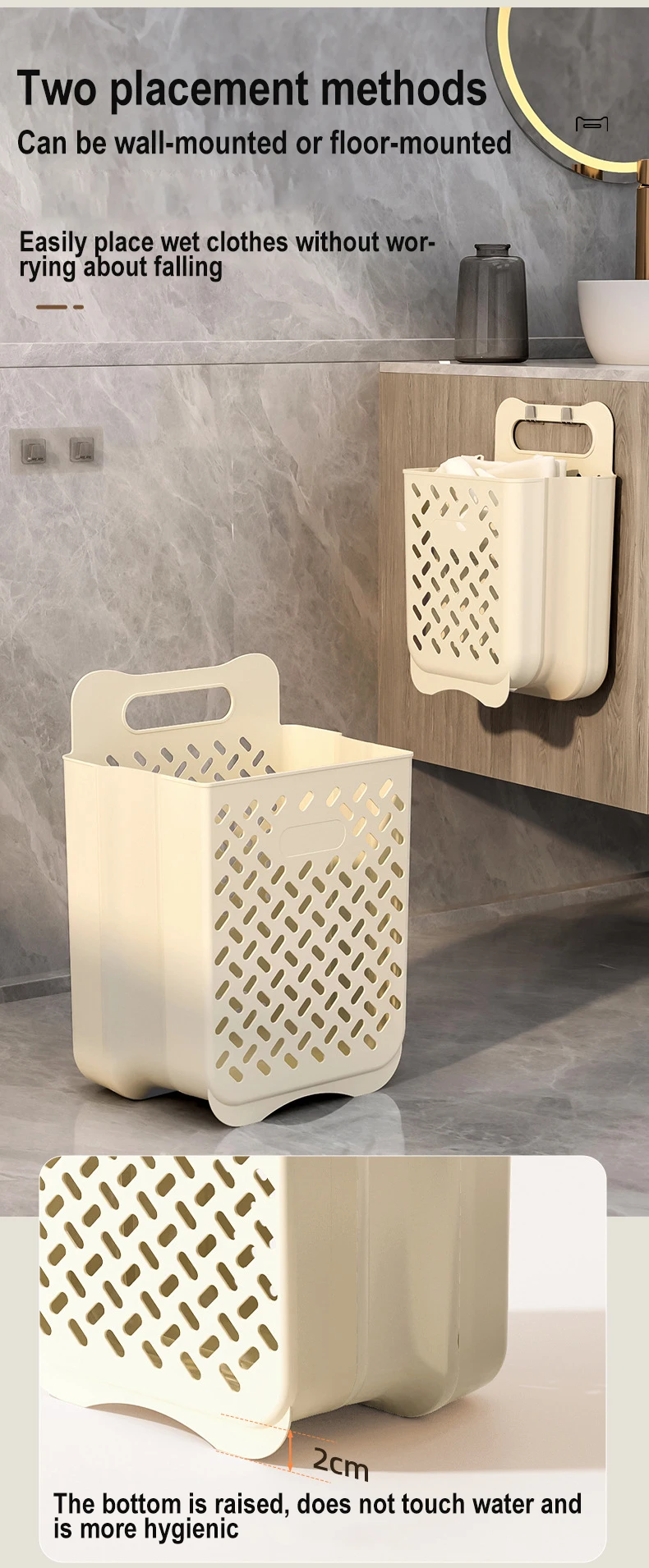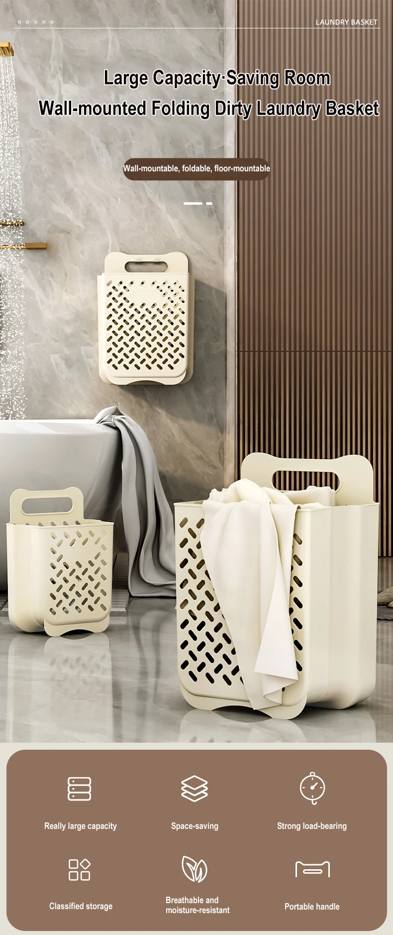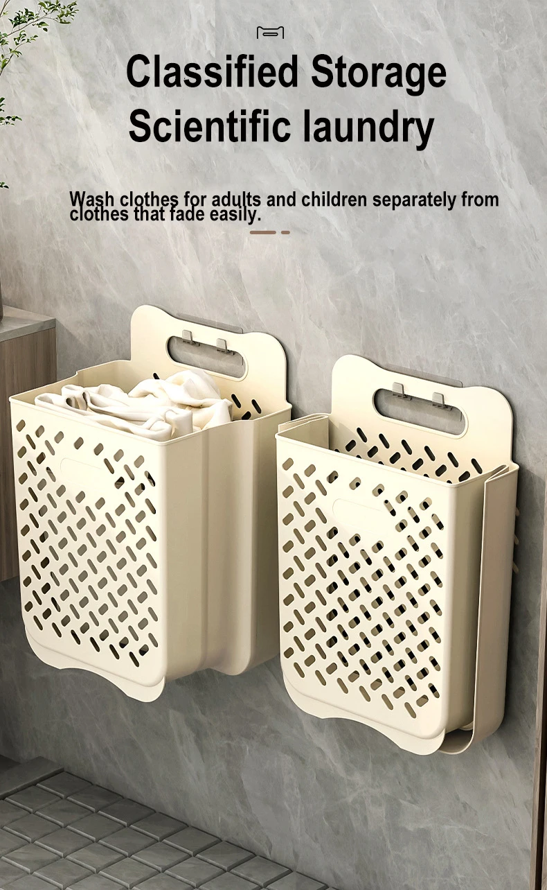 The Dirty Clothes Storage Basket is a portable and foldable organizer for storing dirty laundry in households. It is designed to hang on a wall or door, making it space-efficient and easy to access. The basket can also be used to organize sundries and other items in the bathroom. La conception pliable permet un stockage facile lorsqu'il n'est pas utilisé. Dans l'ensemble, the product is a convenient solution for keeping dirty clothes and other items neat and organized in the home.