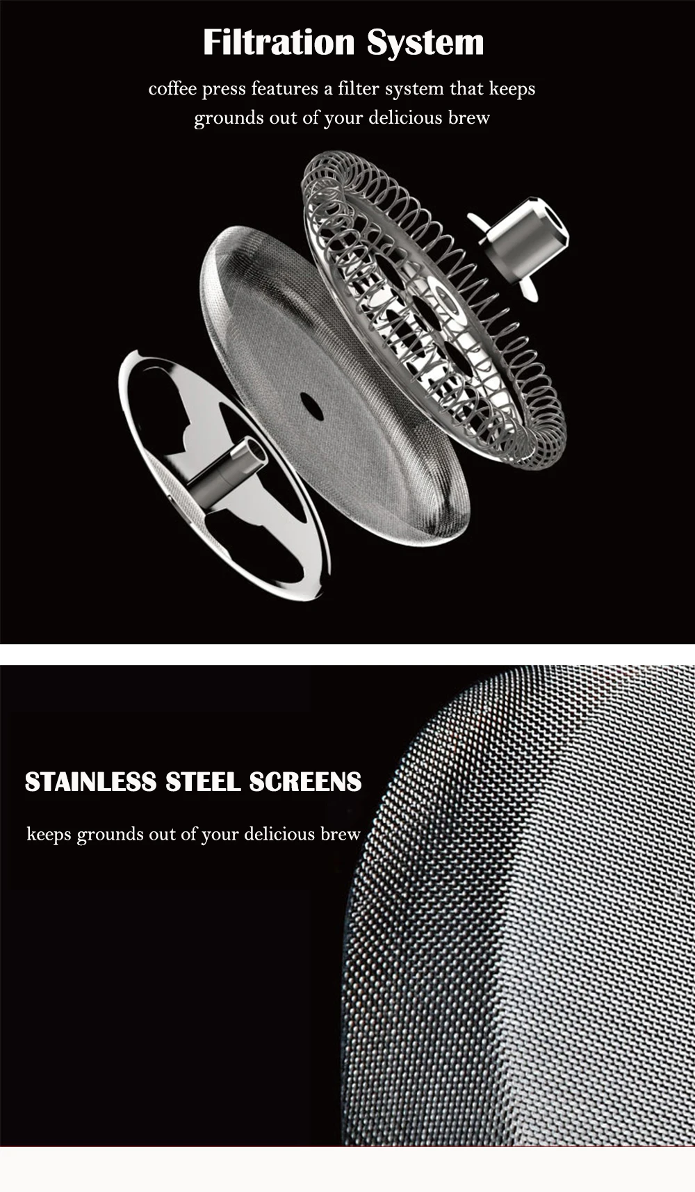 Filtration System: Our coffee press features a 3level filter system that keeps grounds out of your delicious brew. It consists of stainless steel screens, a spring loaded base that seals the edges, and a lid strainer to trap grounds