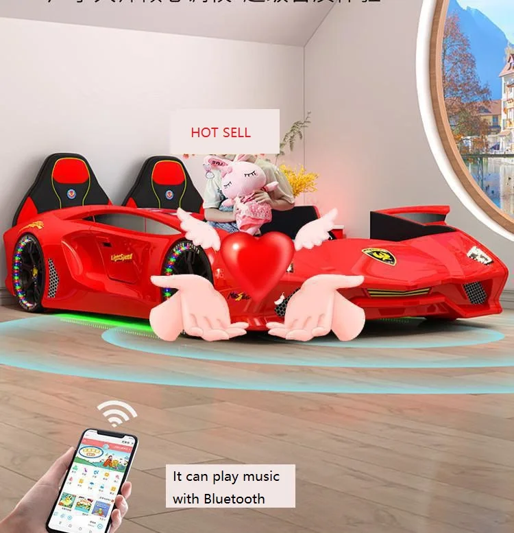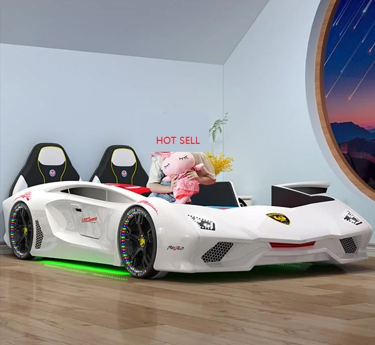 Bien sûr, here is a product description for a full-size luxury car bed for children made of solid wood and fine ABS with colorful LED lights: