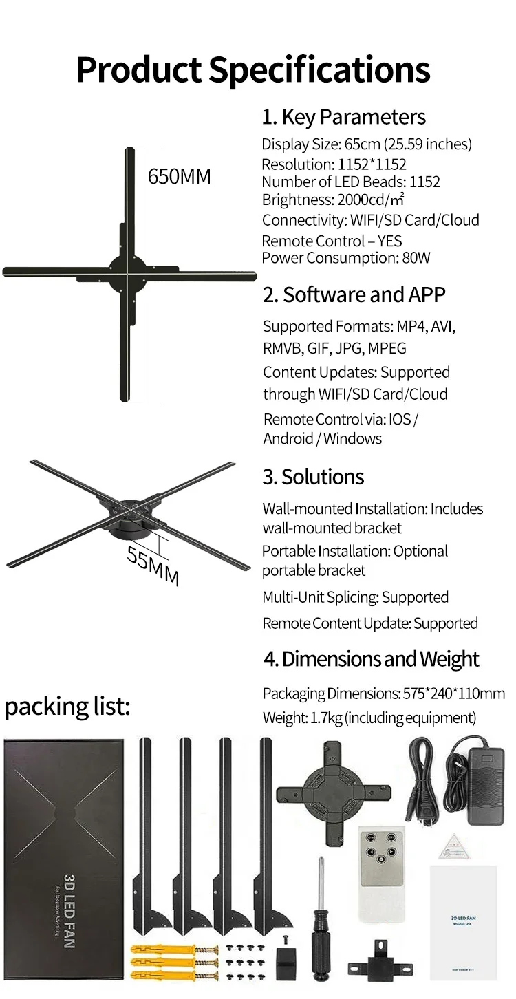 Obtenez le projecteur de fan hologramme 3D 1152x1152 HD 65cm avec des images et des vidéos améliorées