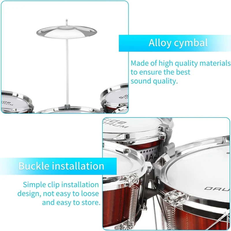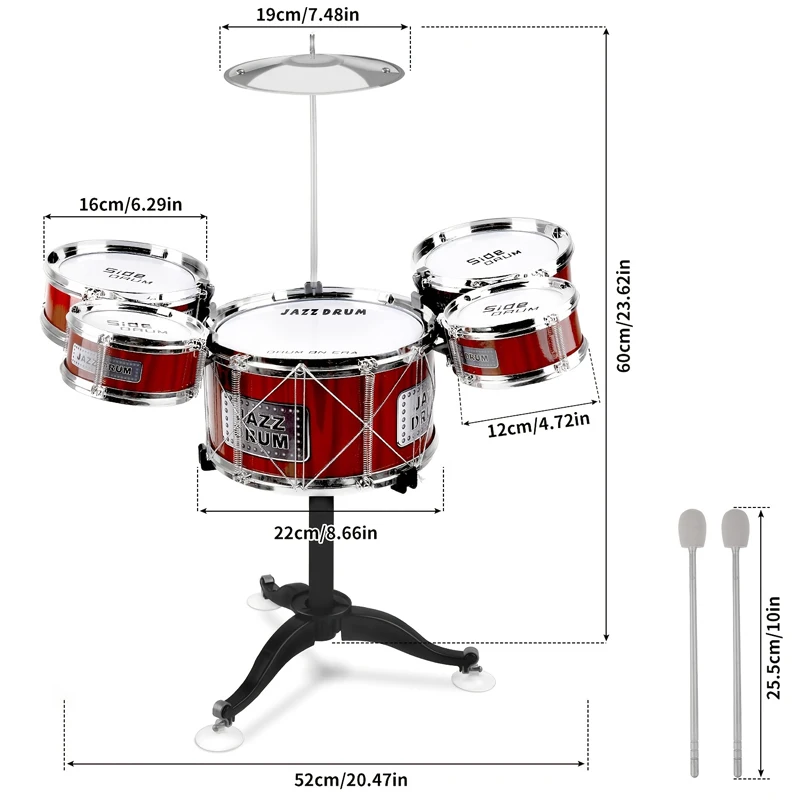 This kids drum set is complete with 5 x small tom-tom drums, 1 x cymbal, 2 x drum sticks and 1 stool.It not only helps your kids learn to drum in a fun environment but also cultivates interest in music at an early age.