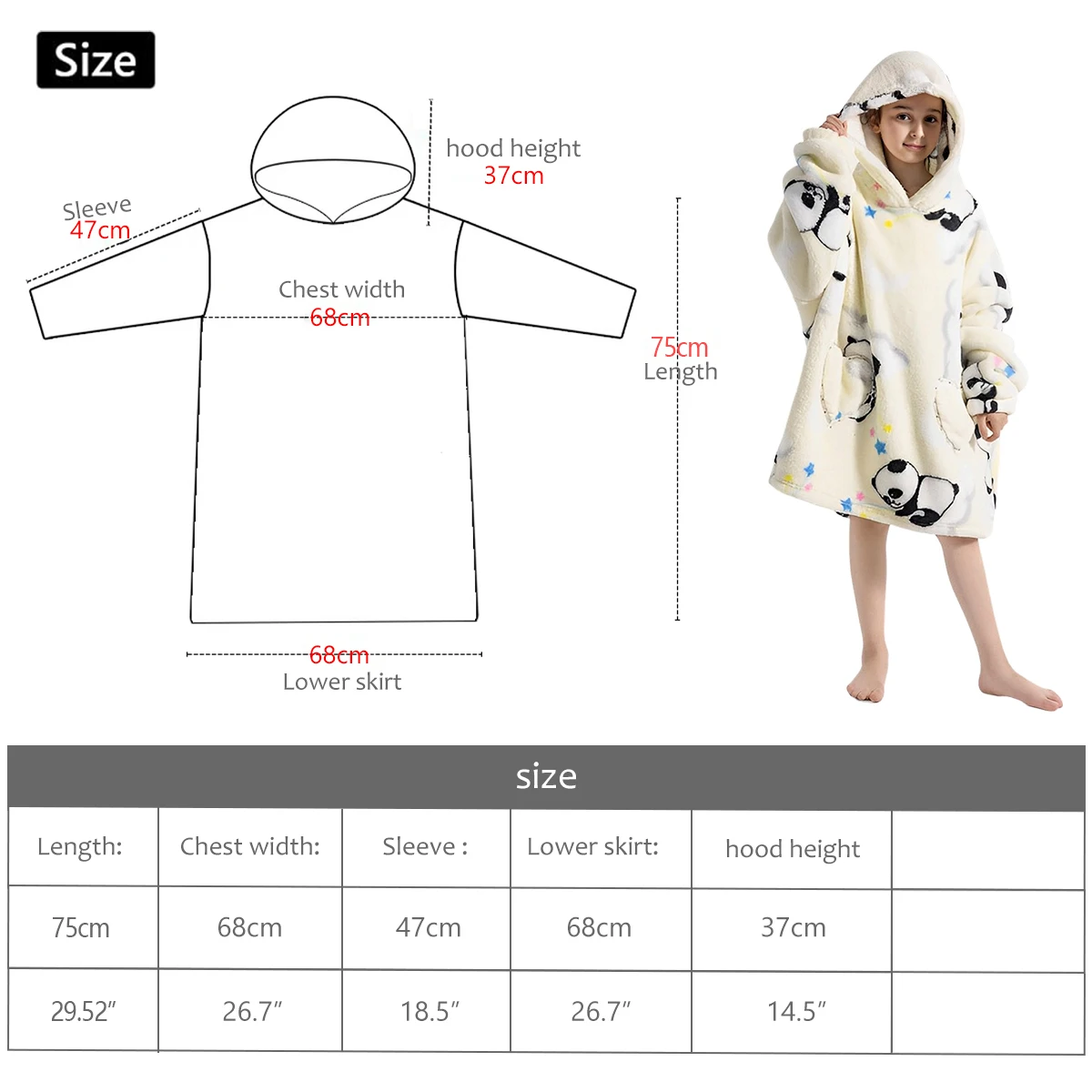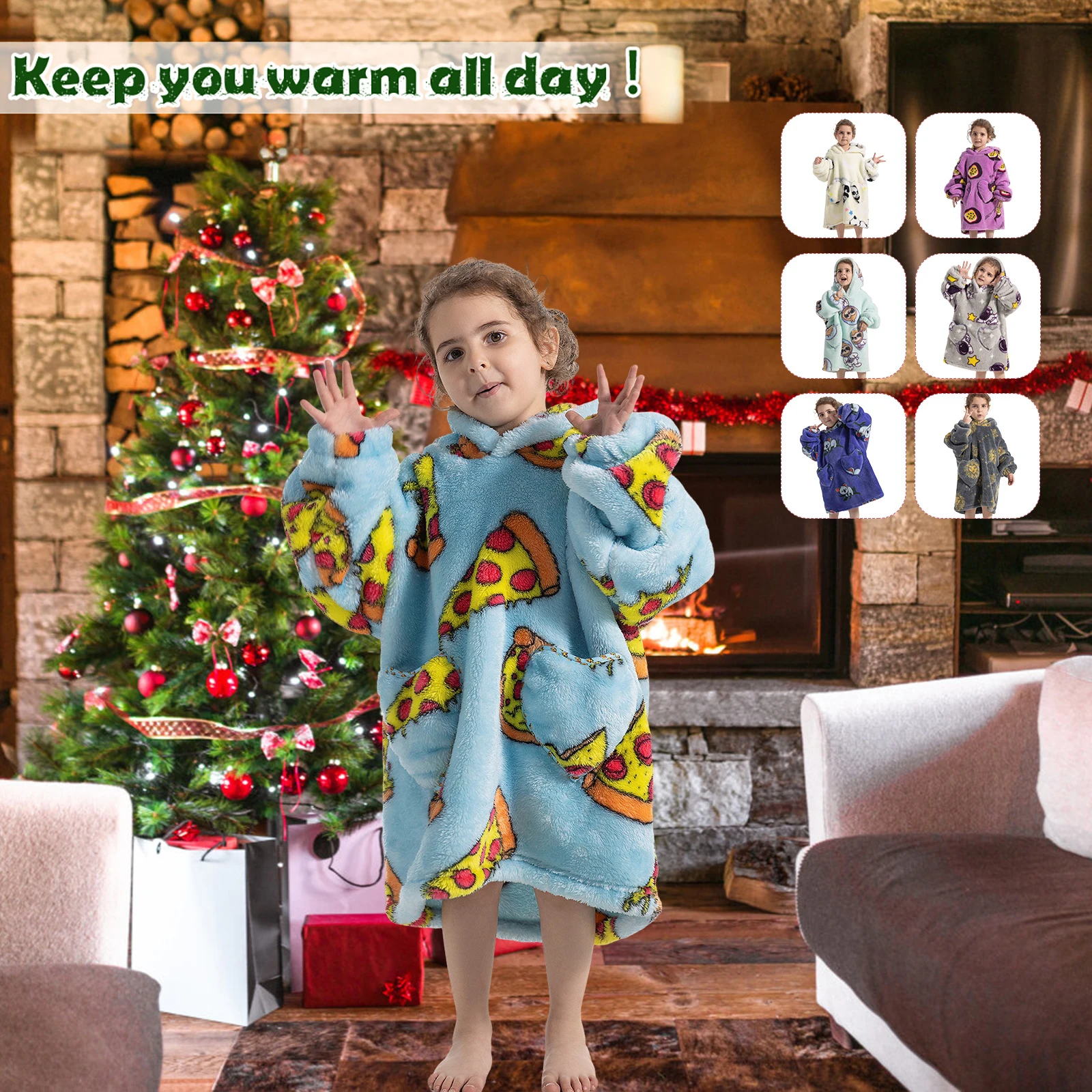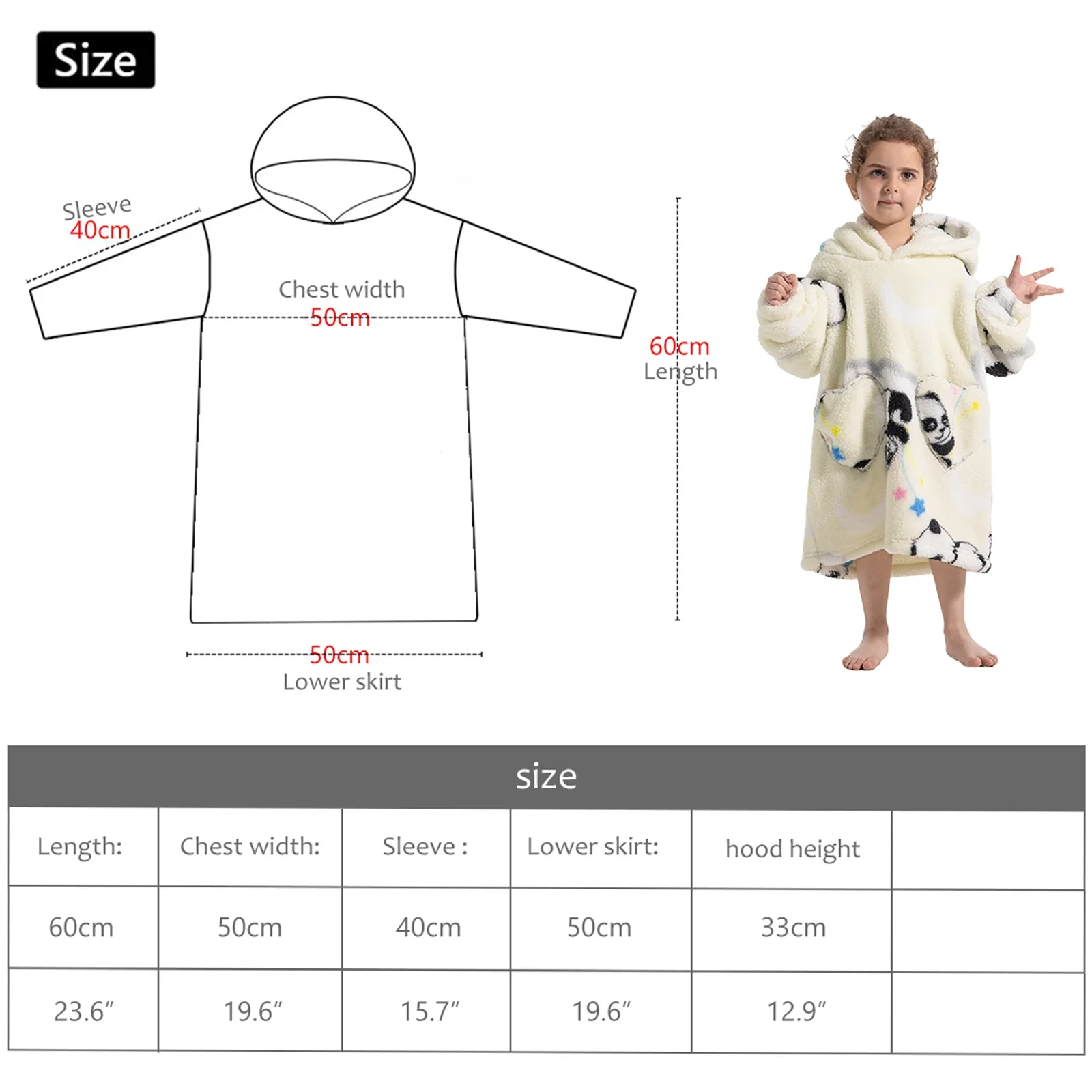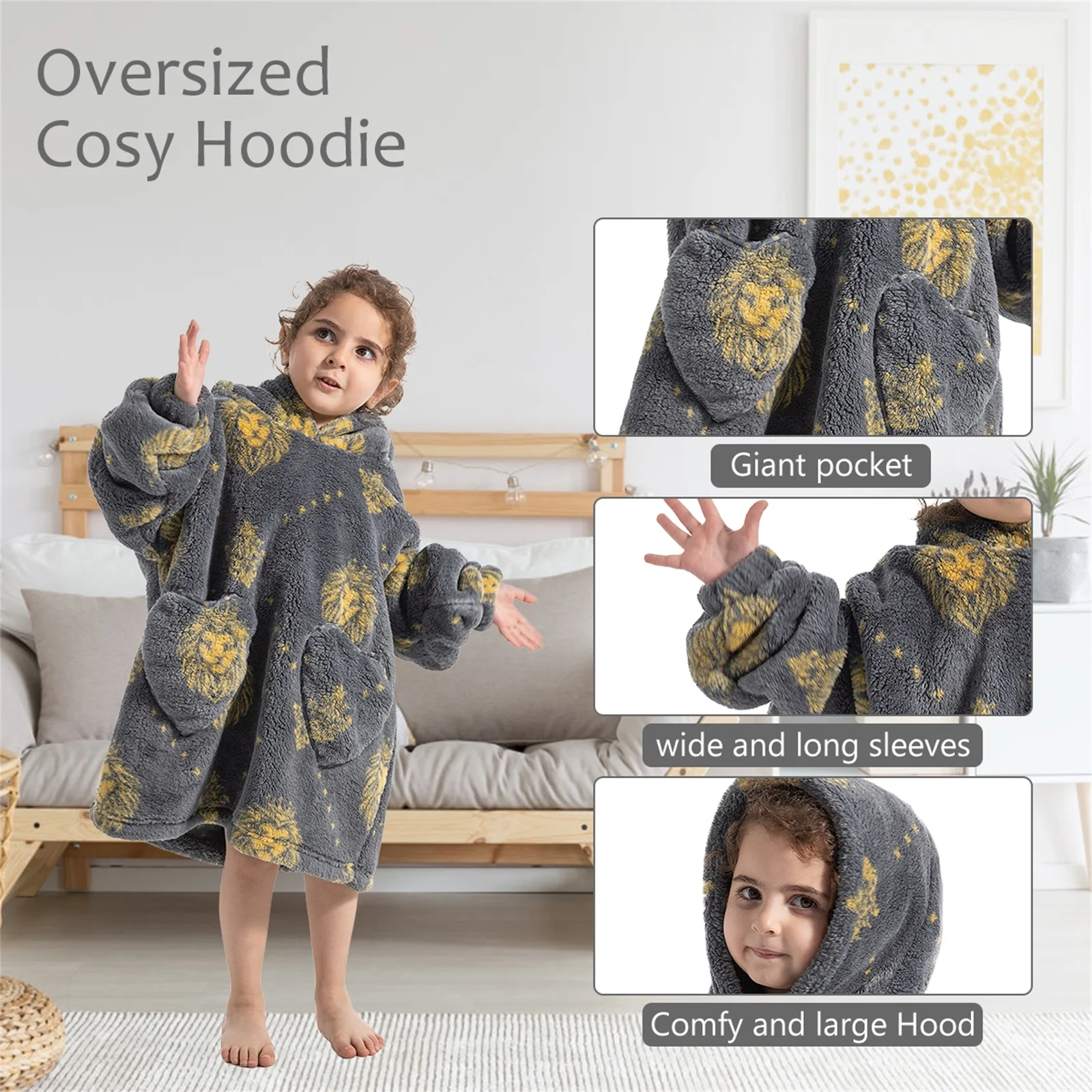 This content describes a kids hoodie blanket made of flannel, designed to be warm and oversized for children or toddlers to wear. The wearable blanket hoodie is unisex and can be used as a hoodie or a sweater blanket. It makes for a cozy and practical gift for young children, providing warmth and comfort during colder weather.