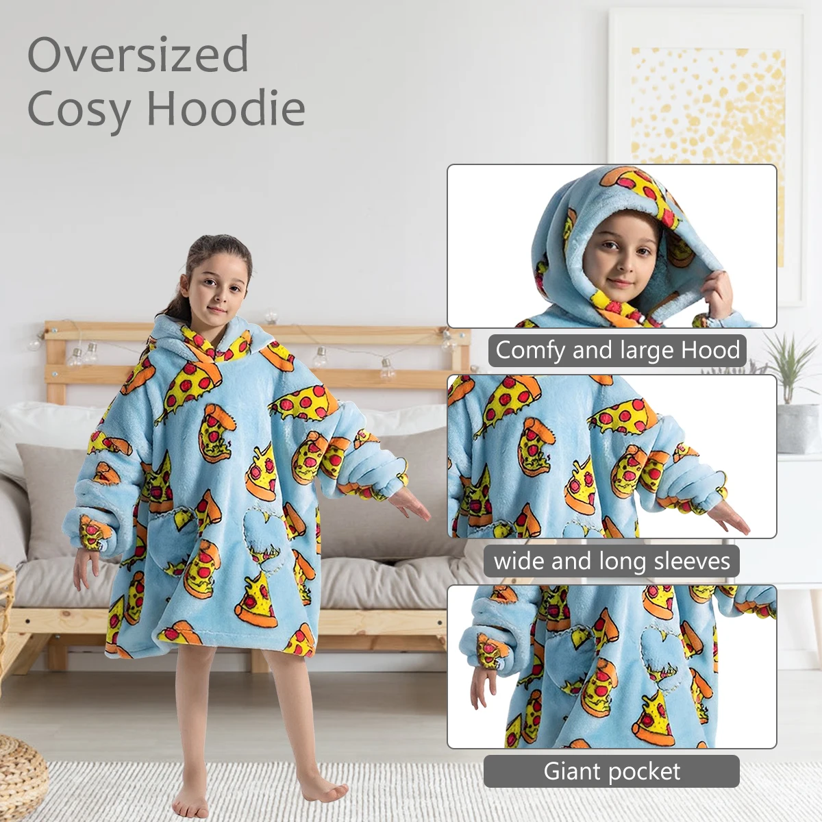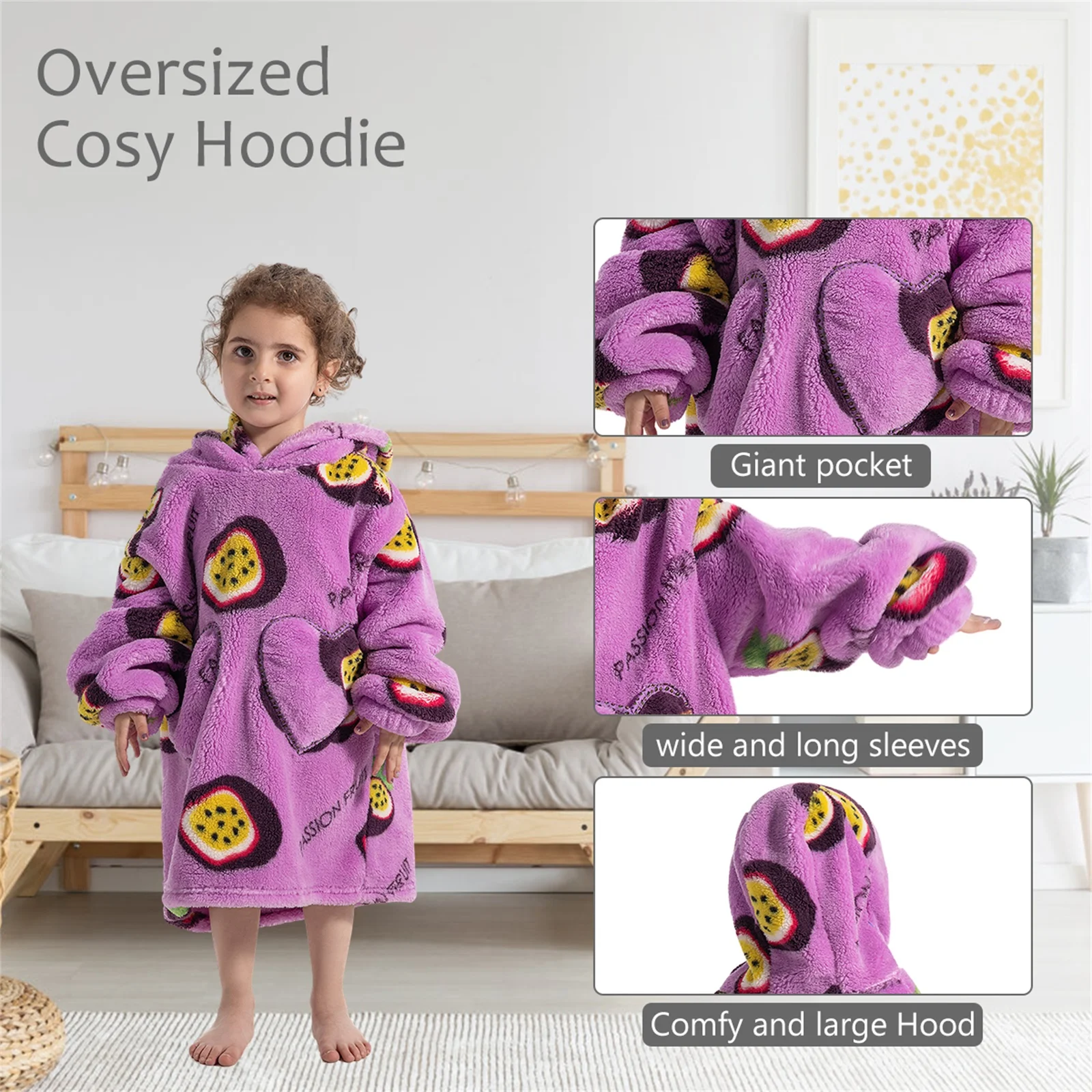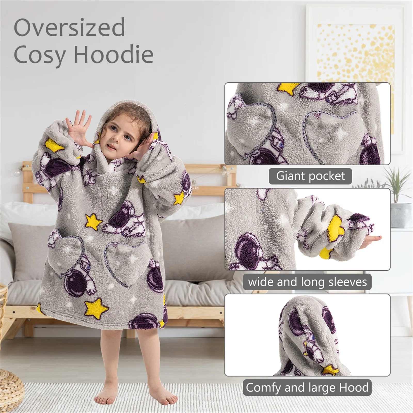 This content describes a kids hoodie blanket made of flannel, designed to be warm and oversized for children or toddlers to wear. The wearable blanket hoodie is unisex and can be used as a hoodie or a sweater blanket. It makes for a cozy and practical gift for young children, providing warmth and comfort during colder weather.