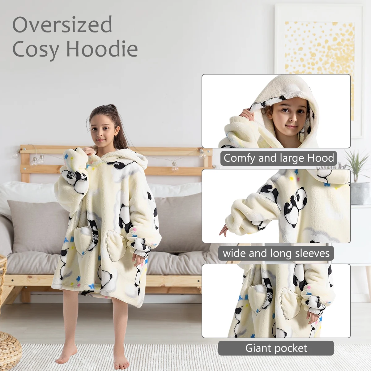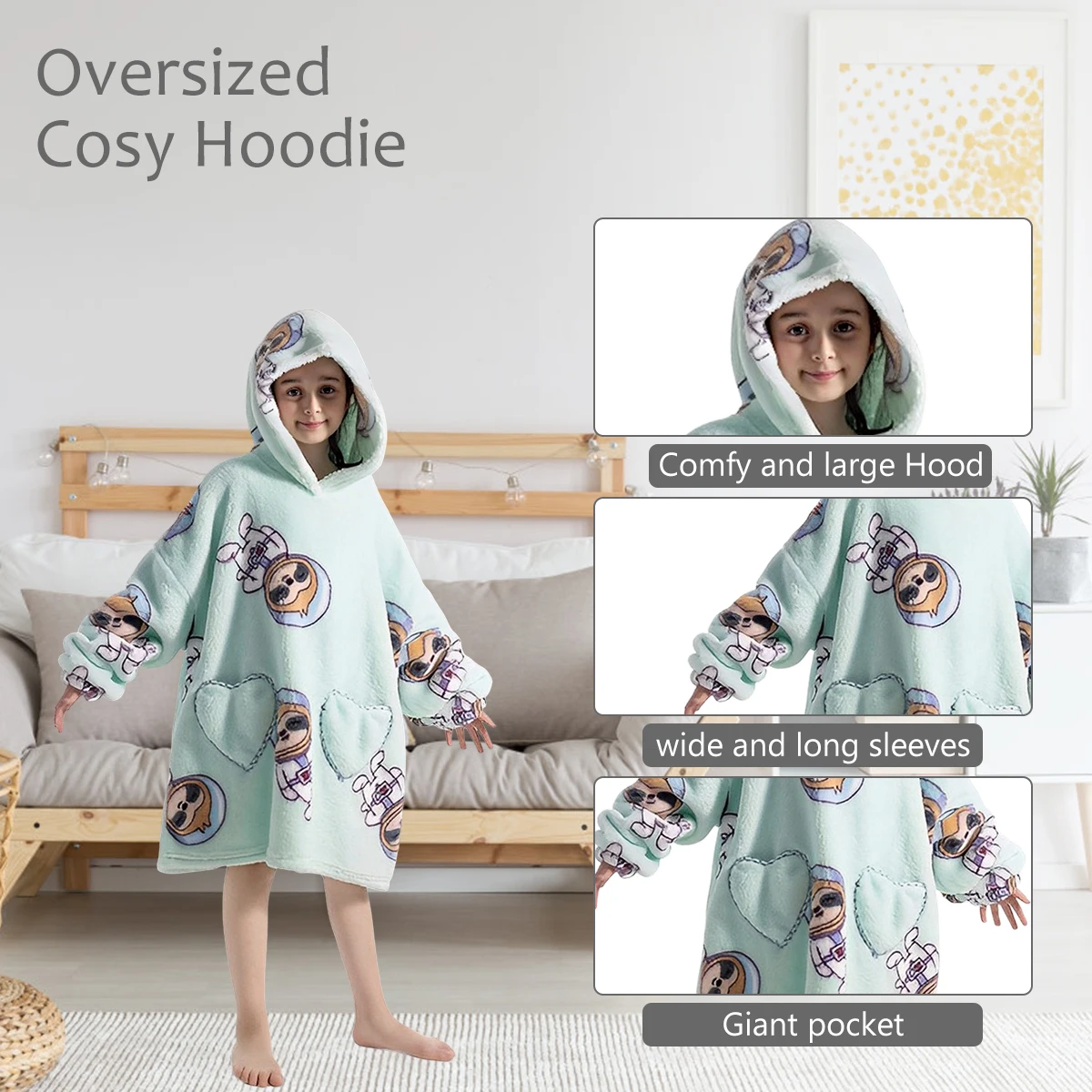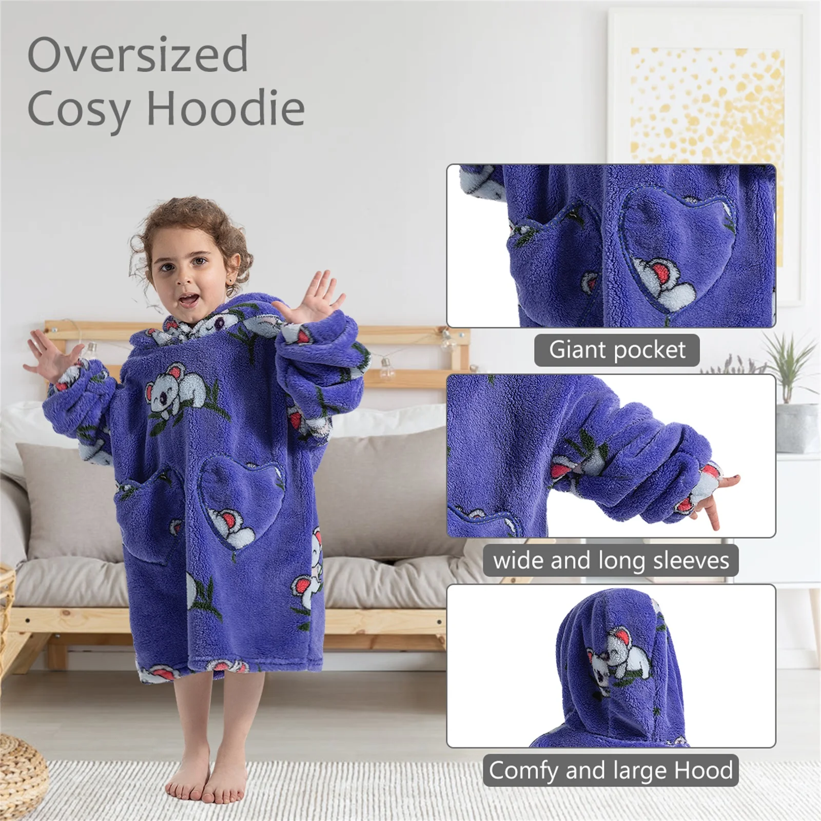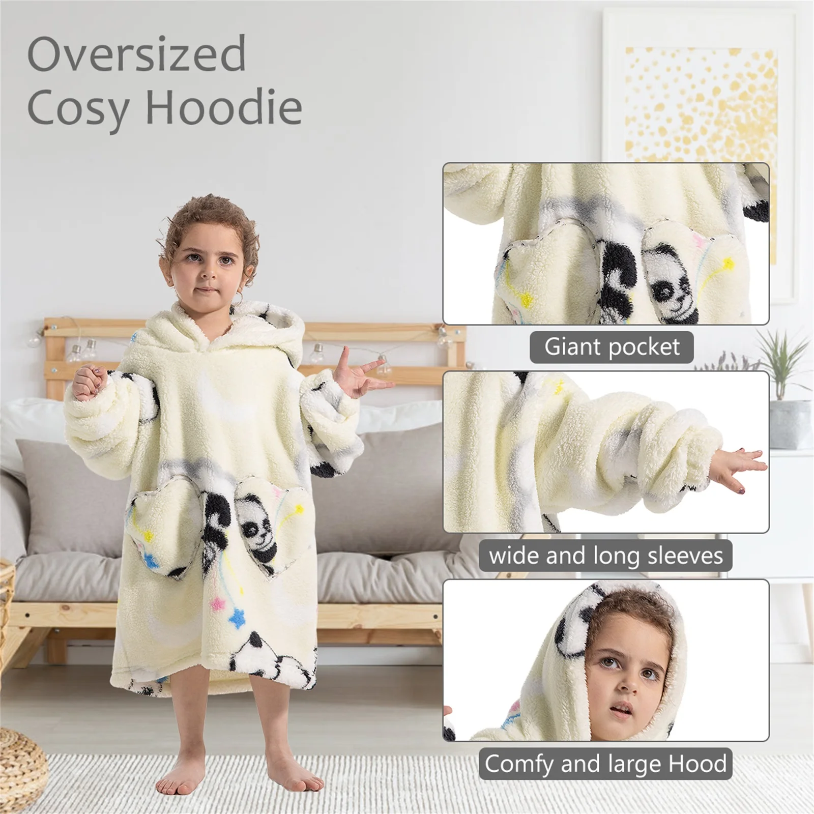 This content describes a kids hoodie blanket made of flannel, designed to be warm and oversized for children or toddlers to wear. The wearable blanket hoodie is unisex and can be used as a hoodie or a sweater blanket. It makes for a cozy and practical gift for young children, providing warmth and comfort during colder weather.