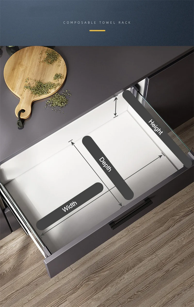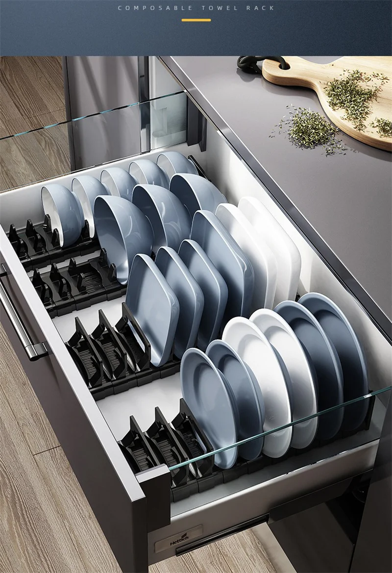 The content describes a kitchen under cabinet drawer that functions as a bowl and dish drying rack, plate storage holder, and tableware organizer. It features adjustable partitions that allow for customization based on individual needs. The rack helps to maximize storage space in the kitchen while keeping dishes organized and easily accessible. Its versatile design makes it suitable for storing various types of bowls, plats, et vaisselle. This under cabinet drawer is a practical solution for efficiently storing and drying kitchen items.