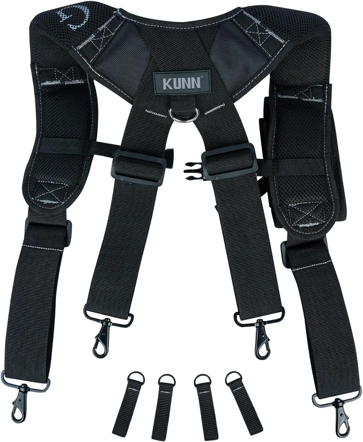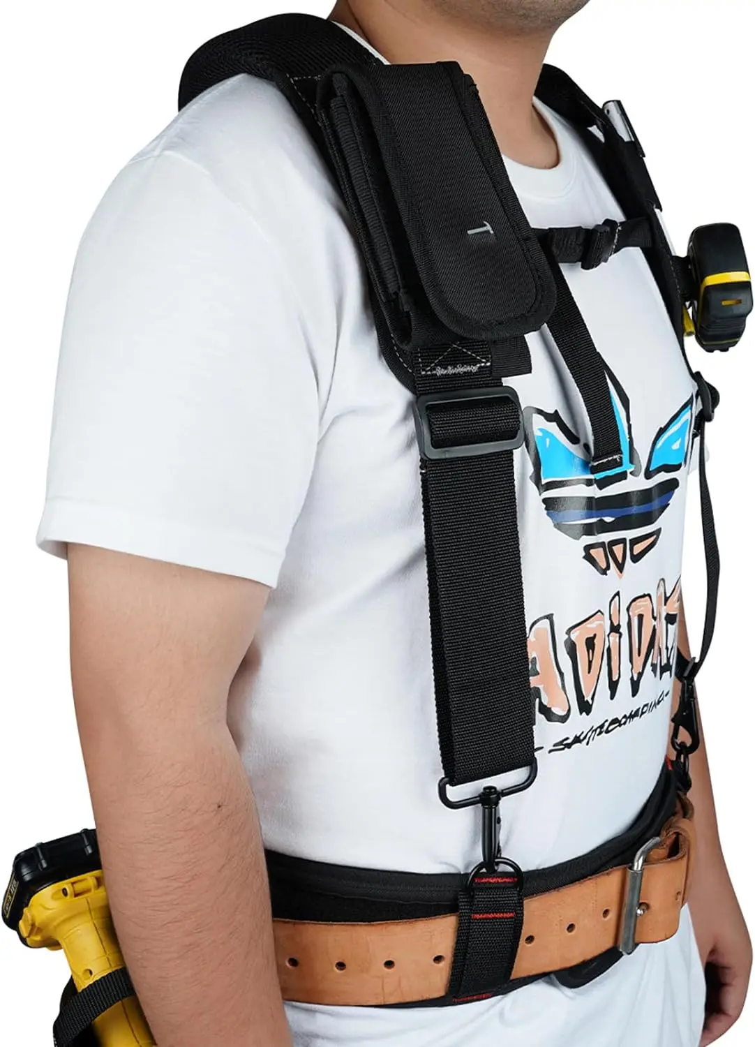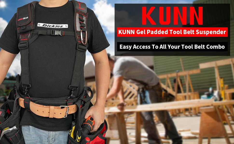 CONSTRUCTION: The tool belt suspenders is made of high quality durable material,4 tool belt loops are easy to add and secure the tool belt,this construction reduces the burden on the hips and lower back and can be worn through a 3 inch wide tool belt.