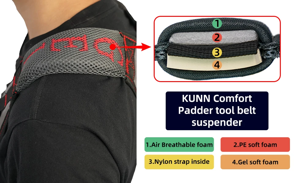 CONFORTABLE: The padded shoulder straps of the gel toolbelt suspender absorb sweat and are breathable,workers will not feel burdened even after long hours of wear.