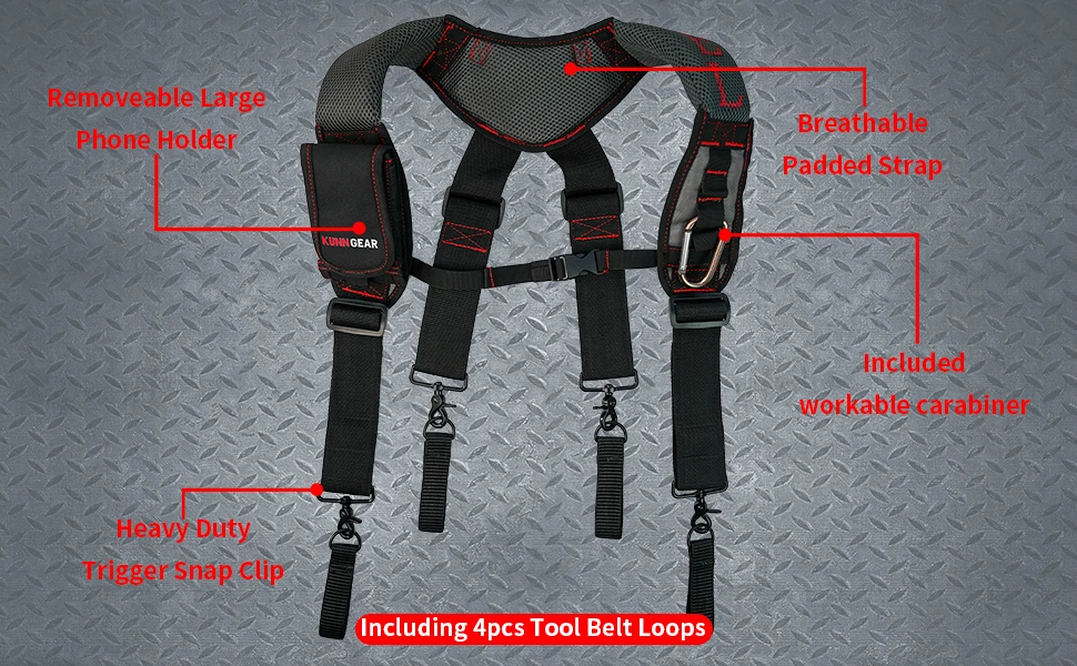 COMPREND: One construction work belt suspender,one cell phone holder and 4 tool belt loops.Removable phone holder holds up to 6.7″ téléphone.