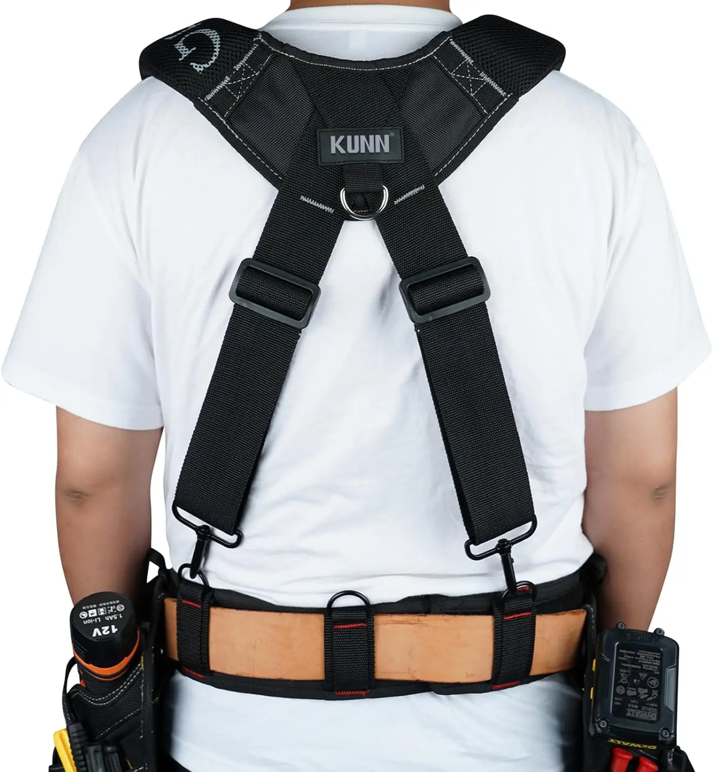 CONSTRUCTION: The tool belt suspenders is made of high quality durable material,4 tool belt loops are easy to add and secure the tool belt,this construction reduces the burden on the hips and lower back and can be worn through a 3 inch wide tool belt.