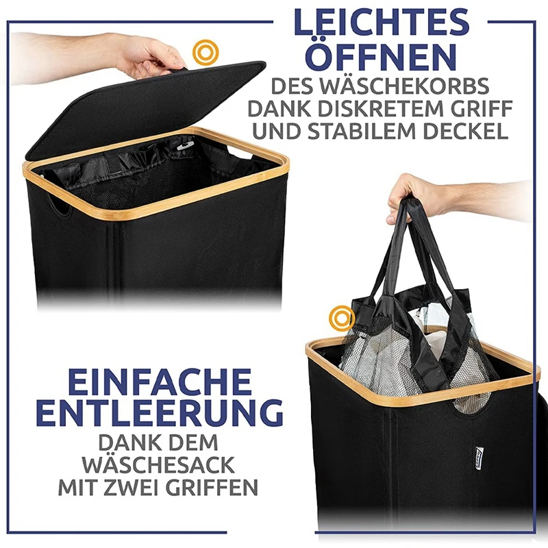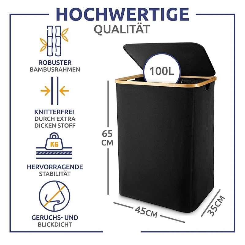 Superior quality – The blend of robust bamboo wood and extra thick fabric ensures outstanding stability for our laundry basket. The support rods and the particularly strong and wrinkle-resistant fabric ensure a long-term use of the sturdy laundry box